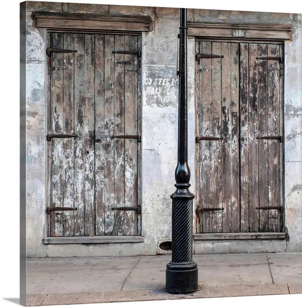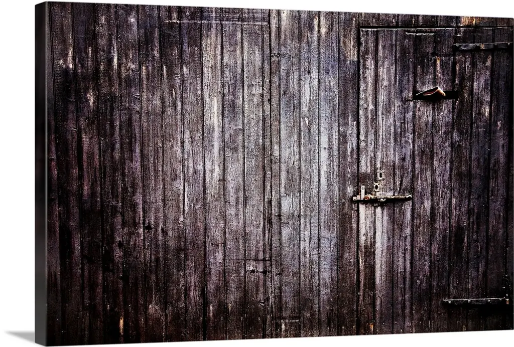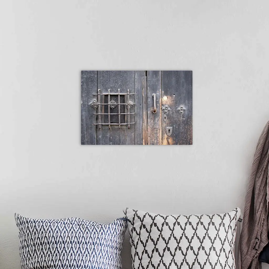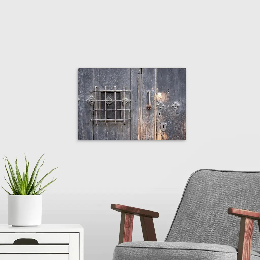 Oversized, horizontal close up photograph of an old wooden door with elaborate safe opening and decorative metal fixtures.