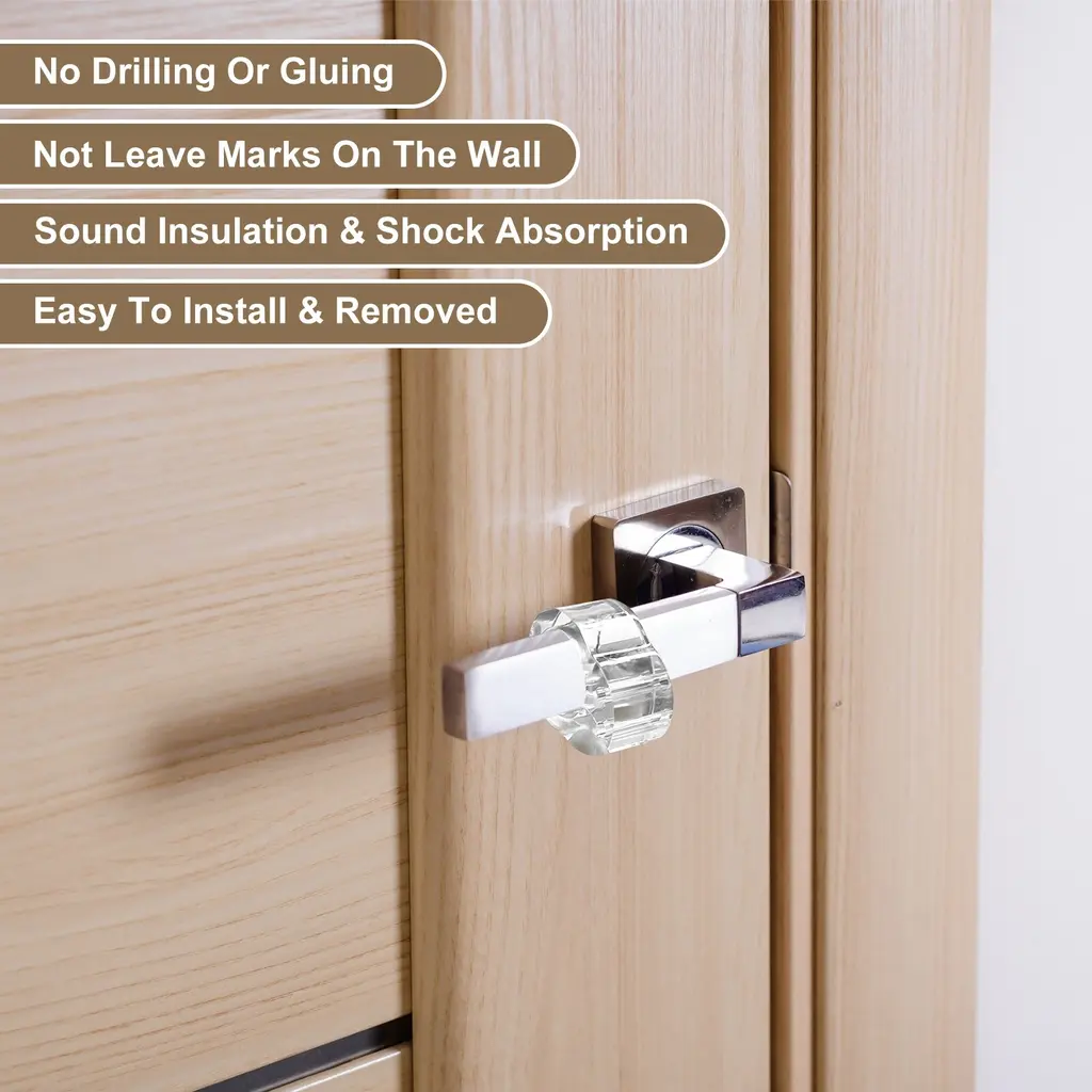 Description:Material: The door handle bumper is made of PVC material, which has a certain degree of softness, is not easy to age, deform, or fade, is durable and corrosion-resistant, and provides long-lasting service for your door handle.Sound Insulation & Shock Absorption: The anti-collision ring adopts a finger ring design, which will not leave marks on the wall to damage the wall. It can effectively absorb impact, reduce noise, protect doors and walls from impact damage, and extend service life.Easy to Use: No drilling or gluing is required. Put the anti-collision finger ring into the door handle for quick installation, saving time and effort. It can be easily removed when not in use.Application: The door stopper suits offices, bedrooms, bathrooms, kitchens, refrigerators, cabinets, drawers, etc. Create a calm and comfortable living environment for you.Specification:Color: ClearMaterial: PVCSuitable for Door Handles Diameter: 18mm / 0.71inchOverall Size: 32x25x13mm / 1.26x0.98x0.51inch (L*W*T)Package Content: 3Pcs x Door Stopper Wall Protector