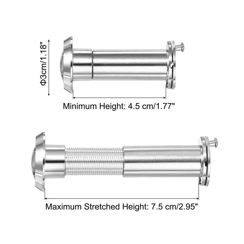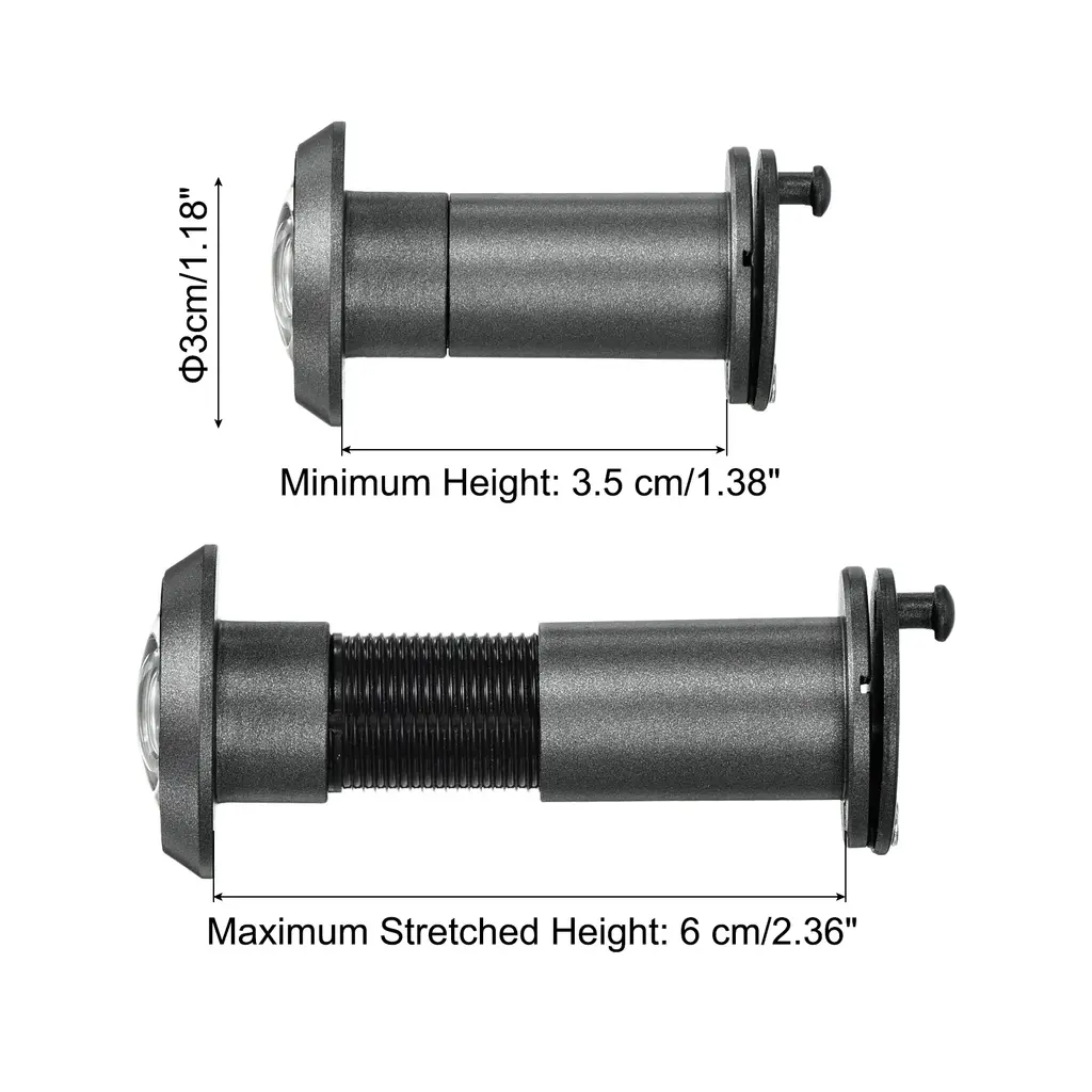 Stylish designed door viewer peepholes consisting of HD lens provides 180 degree view area and crystal clear panoramic view. It is an essential security addition for homes, offices and hotels, suitable for homes, apartments, hotels and any situation where you need to check the situation outside the door before opening it.SpecificationColor: GreyMaterial: Zinc AlloyDiameter Hole: 16-21 mm / 0.62-0.82 InchDoor Thickness: 35-60 mm / 1.38-2.36 InchMinimum Height: 3.5 cm/1.38 Inch, Maximum Stretched Height:6 cm/2.36 InchDoor Viewer Diameter: 1.6 cm/ 5/8 InchWxL: 3 x 3 cm / 1.18 x 1.18 InchDrill Depth: 16 mm / 0.62 Inch, Drill Bit Size: 70 x 16 mm/2.75 x 0.62 InchPacking List: 1 Pcs Door Viewer Peephole, 1 Pcs M35 High-Speed Steel Drill Bit with Spring, 1 Pcs Hex Wrench, 1 Pcs Storage BoxAdvantageThe door peephole viewer is made of durable zinc alloy, and the stylish modern design matches your existing hardware and decoration, blending perfectly with a variety of doors. Designed with a 360-degree rotating privacy cover, The door viewer can take good care of the safety of you and your family.InstructionComes with a 16 mm (5/8 inch) drill bit, which is convenient for drilling and installing the door peephole viewer.NOTE: Please confirm the door thickness to choose the appropriate door viewer peephole.