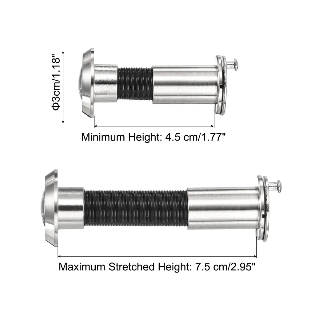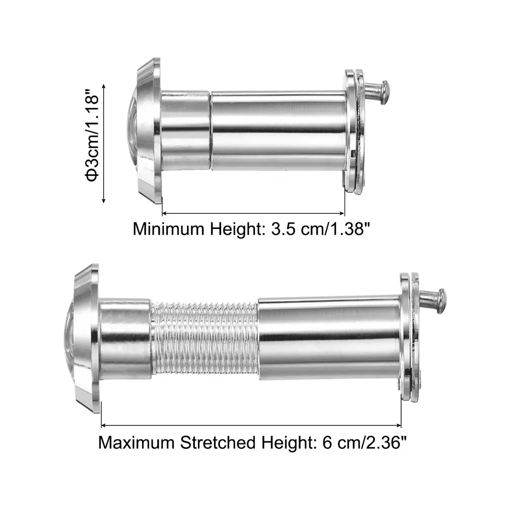 Stylish designed door viewer peepholes consisting of HD lens provides 180 degree view area and crystal clear panoramic view. It is an essential security addition for homes, offices and hotels, suitable for homes, apartments, hotels and any situation where you need to check the situation outside the door before opening it.SpecificationColor: GreyMaterial: Zinc AlloyDiameter Hole: 16-21 mm / 0.62-0.82 InchDoor Thickness: 35-60 mm / 1.38-2.36 InchMinimum Height: 3.5 cm/1.38 Inch, Maximum Stretched Height:6 cm/2.36 InchDoor Viewer Diameter: 1.6 cm/ 5/8 InchWxL: 3 x 3 cm / 1.18 x 1.18 InchDrill Depth: 16 mm / 0.62 Inch, Drill Bit Size: 70 x 16 mm/2.75 x 0.62 InchPacking List: 1 Pcs Door Viewer Peephole, 1 Pcs M35 High-Speed Steel Drill Bit with Spring, 1 Pcs Hex Wrench, 1 Pcs Storage BoxAdvantageThe door peephole viewer is made of durable zinc alloy, and the stylish modern design matches your existing hardware and decoration, blending perfectly with a variety of doors. Designed with a 360-degree rotating privacy cover, The door viewer can take good care of the safety of you and your family.InstructionComes with a 16 mm (5/8 inch) drill bit, which is convenient for drilling and installing the door peephole viewer.NOTE: Please confirm the door thickness to choose the appropriate door viewer peephole.