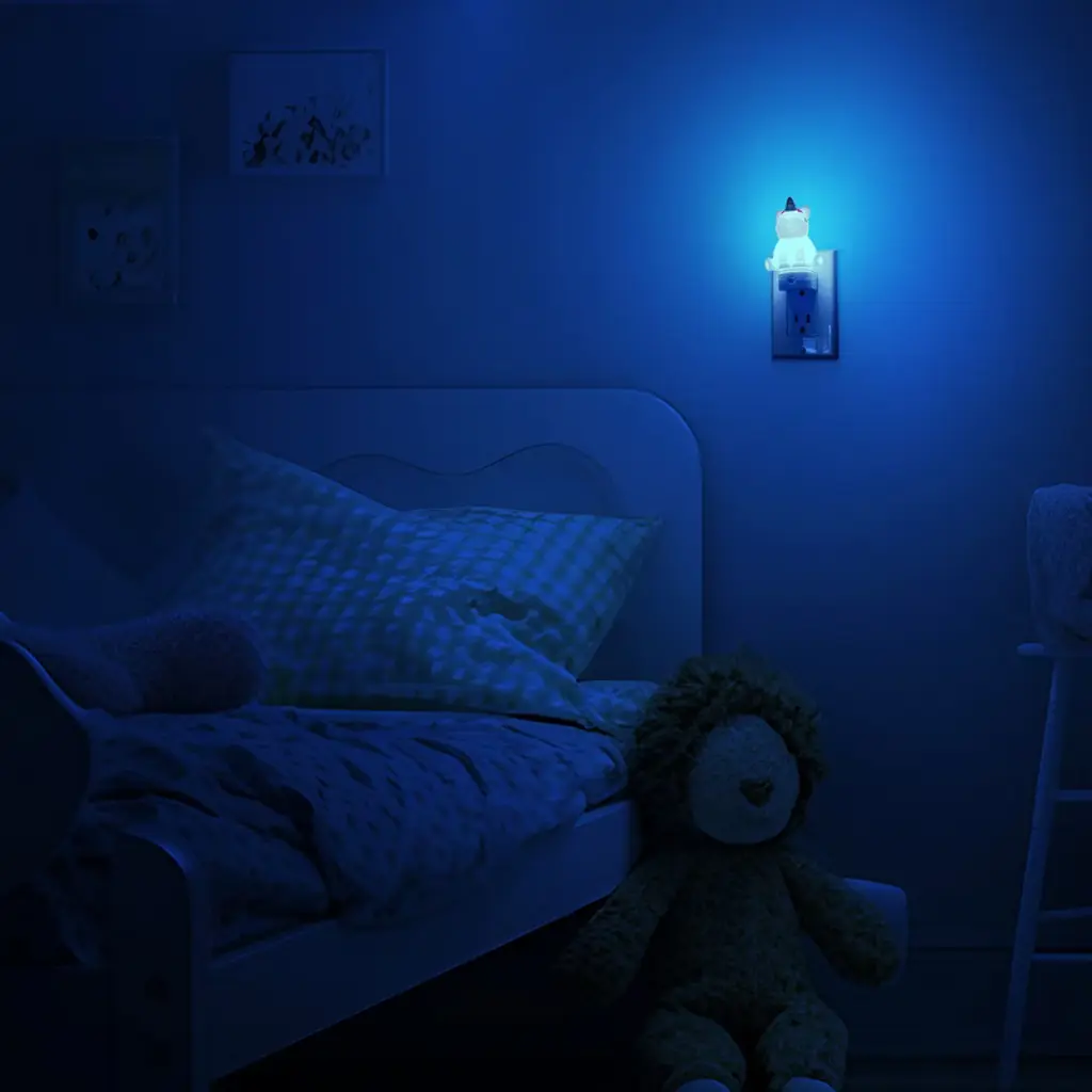 This 0.5W plug-in night light features a charming unicorn design with a white housing and dual plug, perfect for bedrooms, nurseries, or decorative accent lighting. The light offers 3000K warm white at 50%-100% brightness and a full RGB gradient option, allowing flexible ambiance control. Users can adjust color via the button, long press for 2 seconds to turn off, and restart to retain color memory; note that the light sensor does not operate while the light is off.