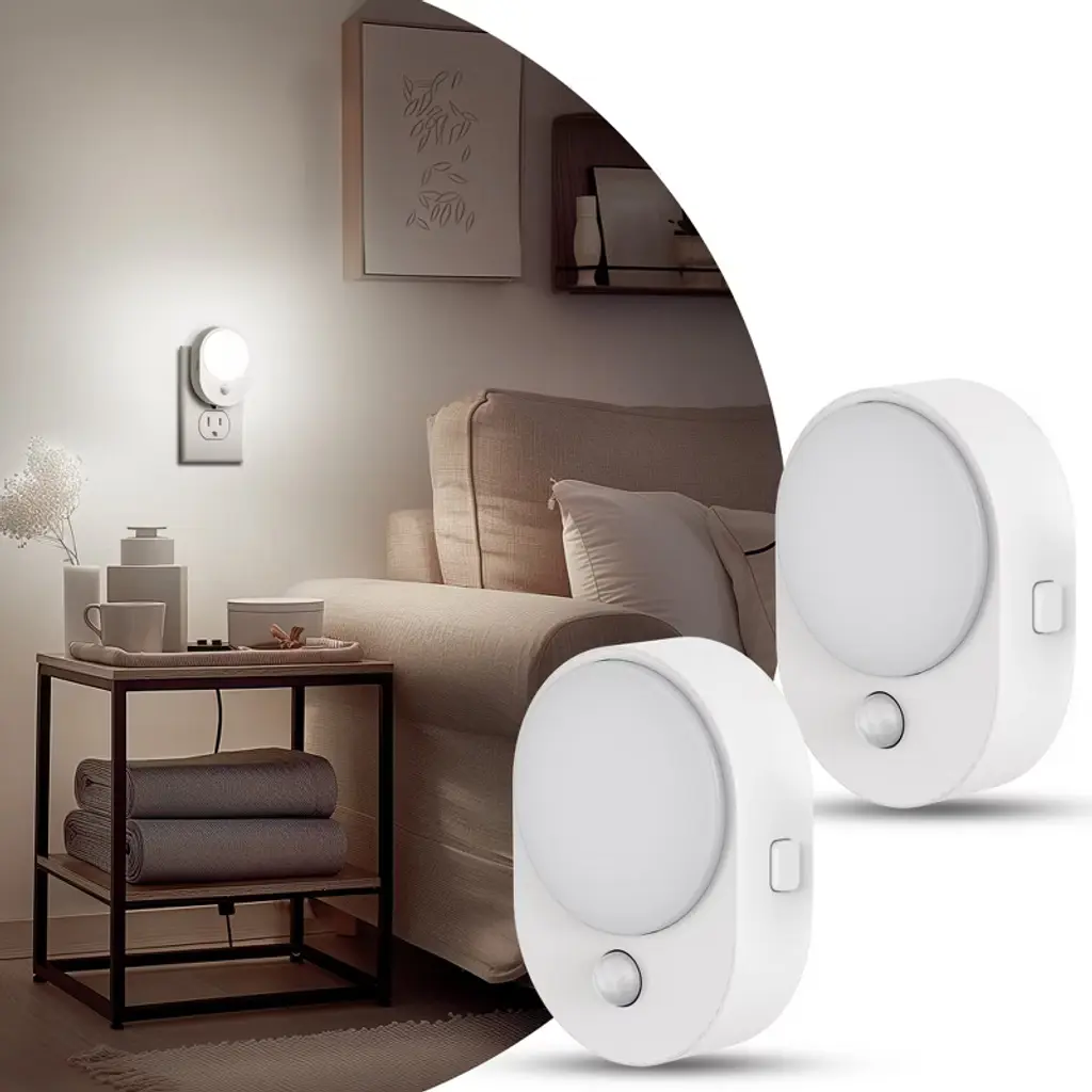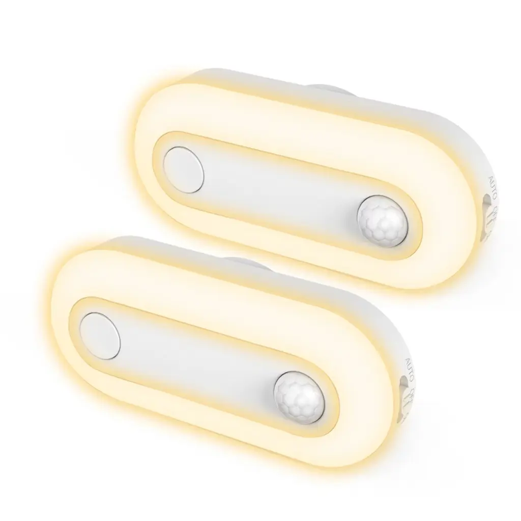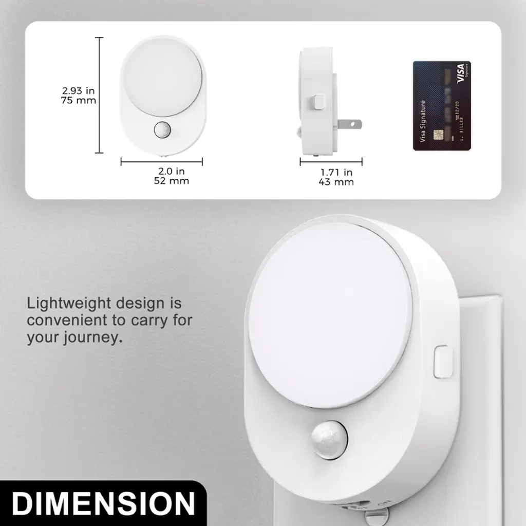 This 2-pack of 0.6W plug-in oval night lights features a sleek white design with integrated motion sensor and adjustable light settings, ideal for bedrooms, hallways, or closets. Each night light emits 5000K white light, providing clear and comfortable illumination for nighttime activities. Users can easily select between ON, OFF, and AUTO (motion-sensing) modes with three-level dimming, offering energy-efficient and convenient lighting.