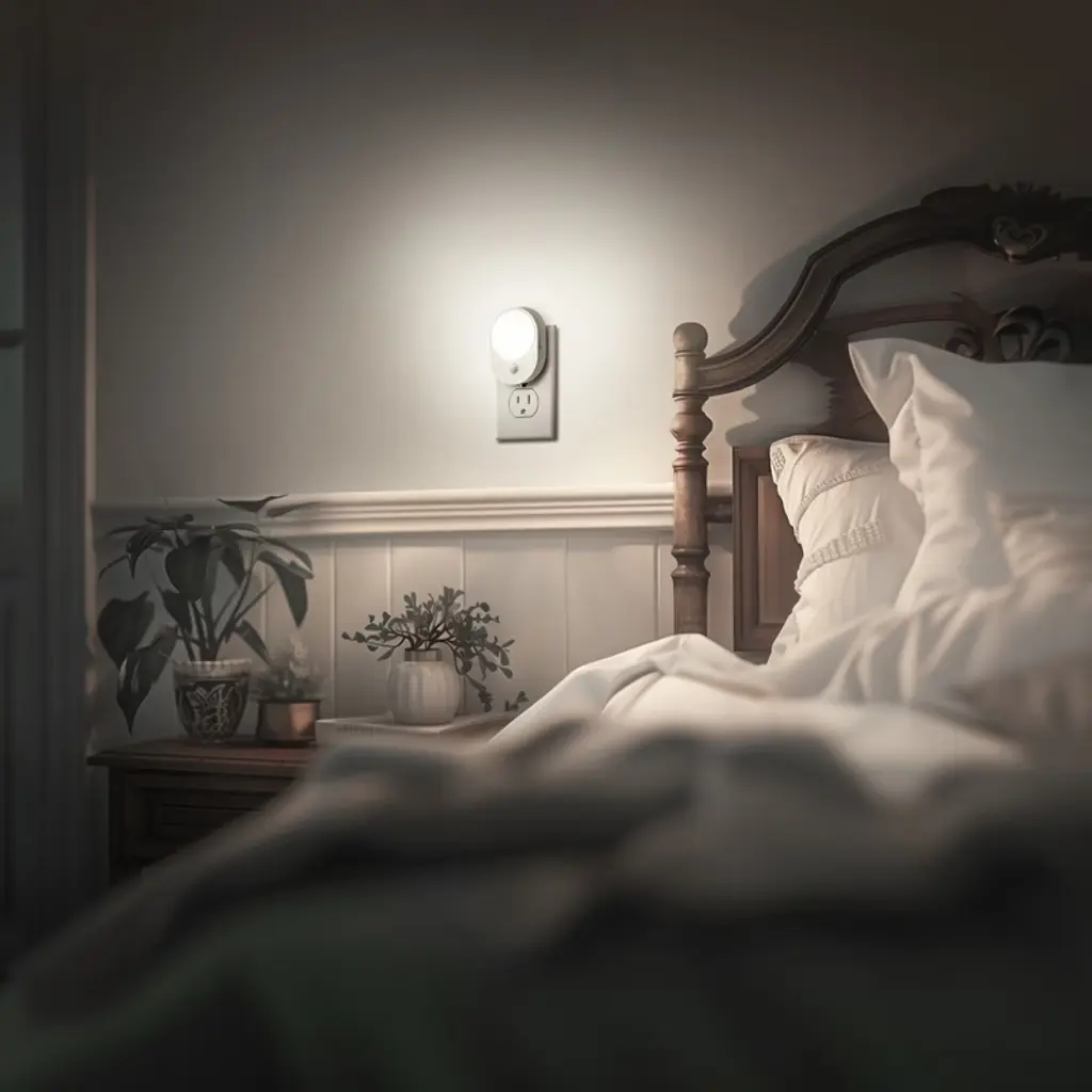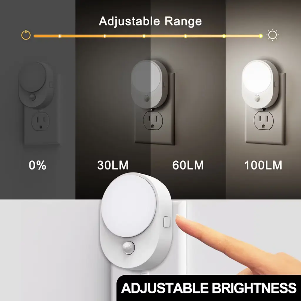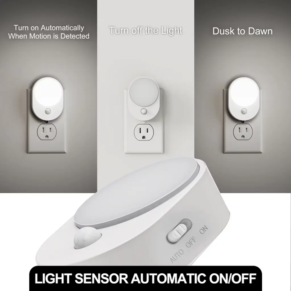 This 2-pack of 0.6W plug-in oval night lights features a sleek white design with integrated motion sensor and adjustable light settings, ideal for bedrooms, hallways, or closets. Each night light emits 5000K white light, providing clear and comfortable illumination for nighttime activities. Users can easily select between ON, OFF, and AUTO (motion-sensing) modes with three-level dimming, offering energy-efficient and convenient lighting.