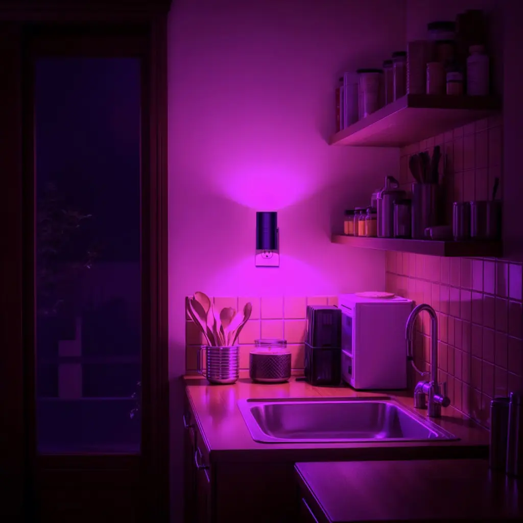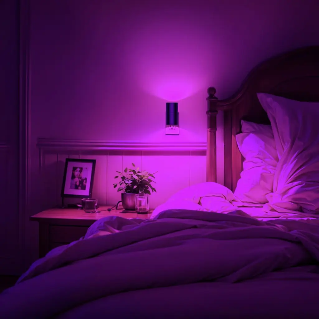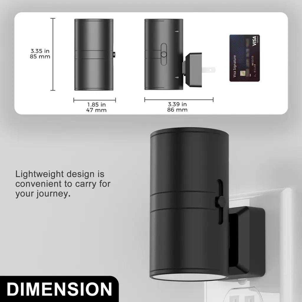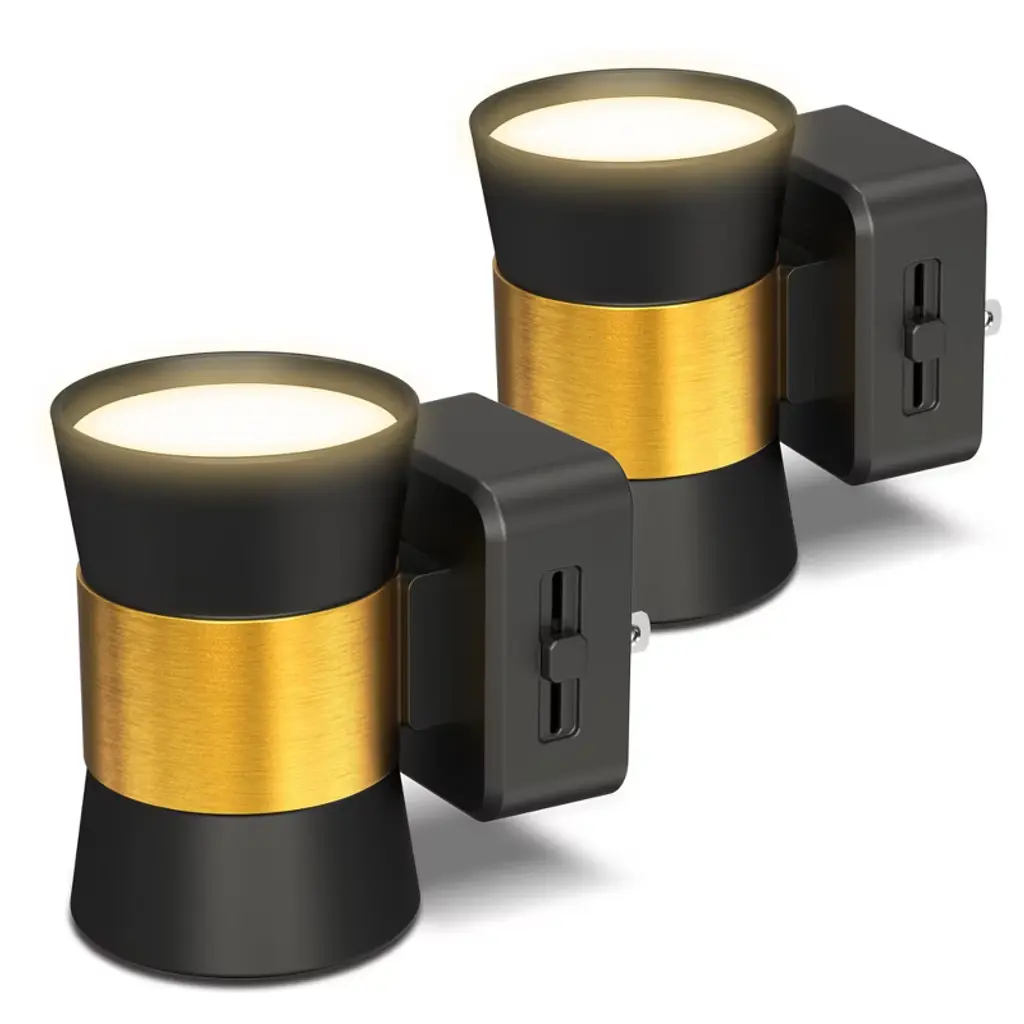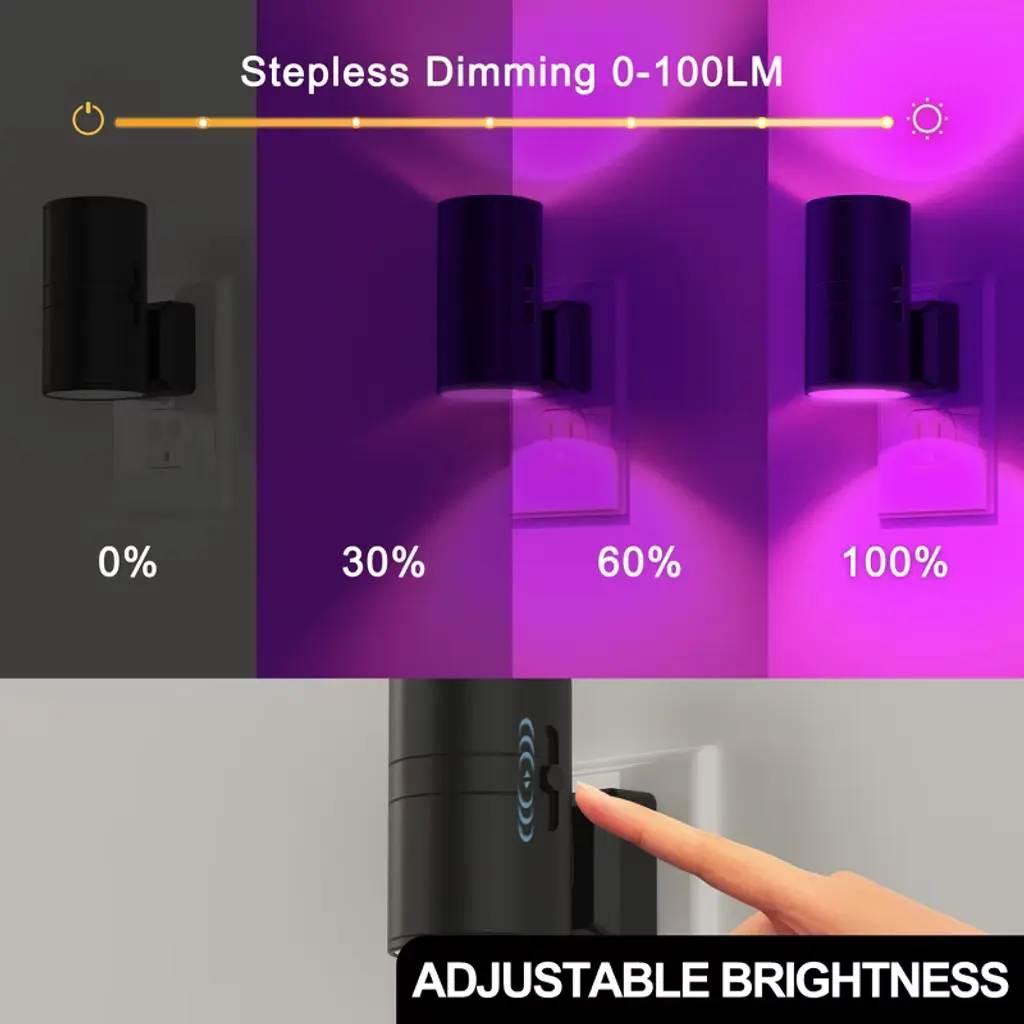 This 2-pack of 1W plug-in cylinder night lights features a black housing with a white PC diffuser, providing purple illumination ideal for bedrooms, hallways, or decorative spaces. Each light includes a sliding dimmer for adjustable brightness from 0% to 100%, allowing flexible ambiance control. The built-in light sensor automatically turns the lights on in low light and off during the day, offering convenient and energy-efficient operation.