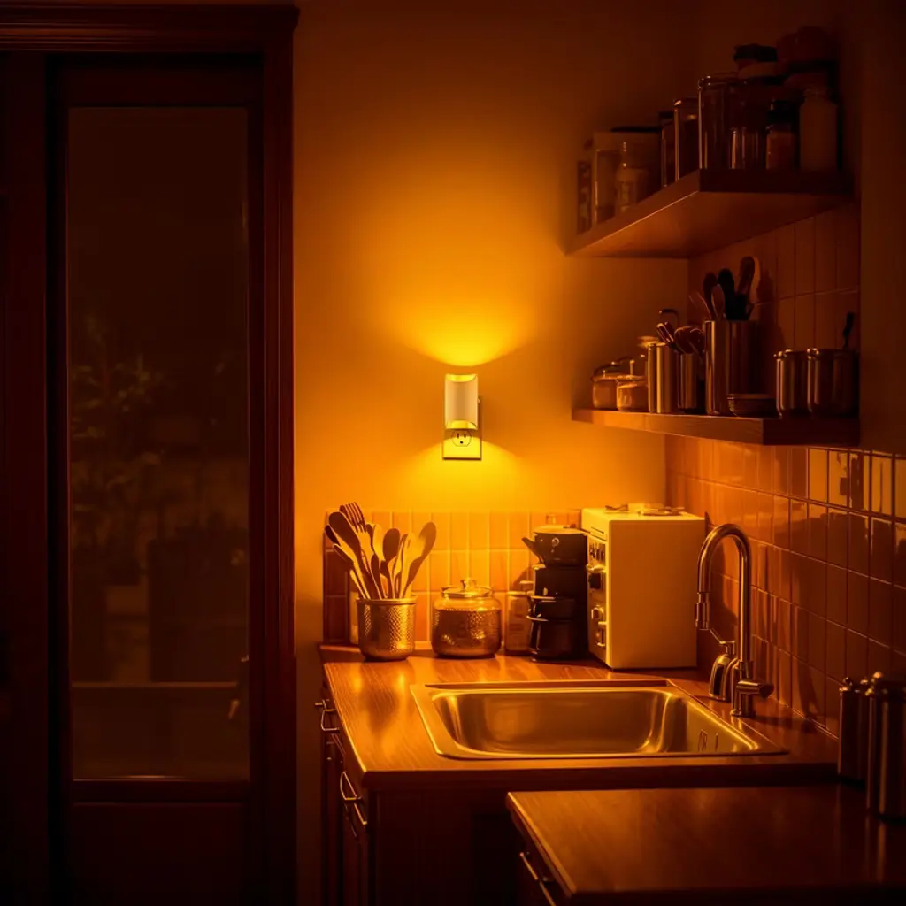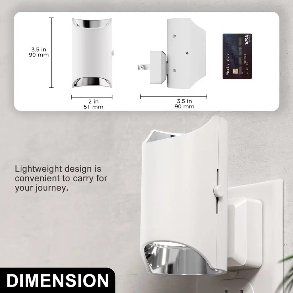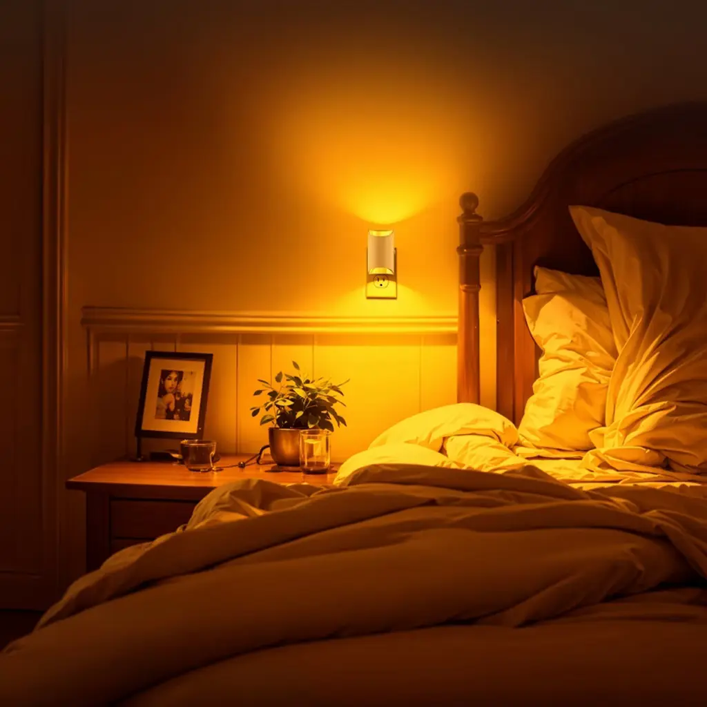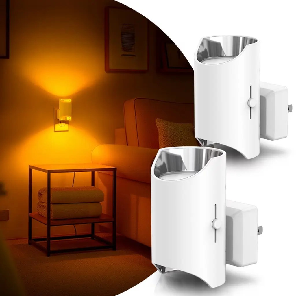 This 2-pack of 1W plug-in night lights features cylindrical housings with up-down illumination and an electroplated cut design, perfect for bedrooms, hallways, or decorative areas. Each light includes a sliding dimmer to adjust brightness from 0% to 100% and emits warm amber light at 1600K. The built-in light sensor automatically turns the lights on in low light and off during daylight, ensuring convenient and energy-efficient operation.