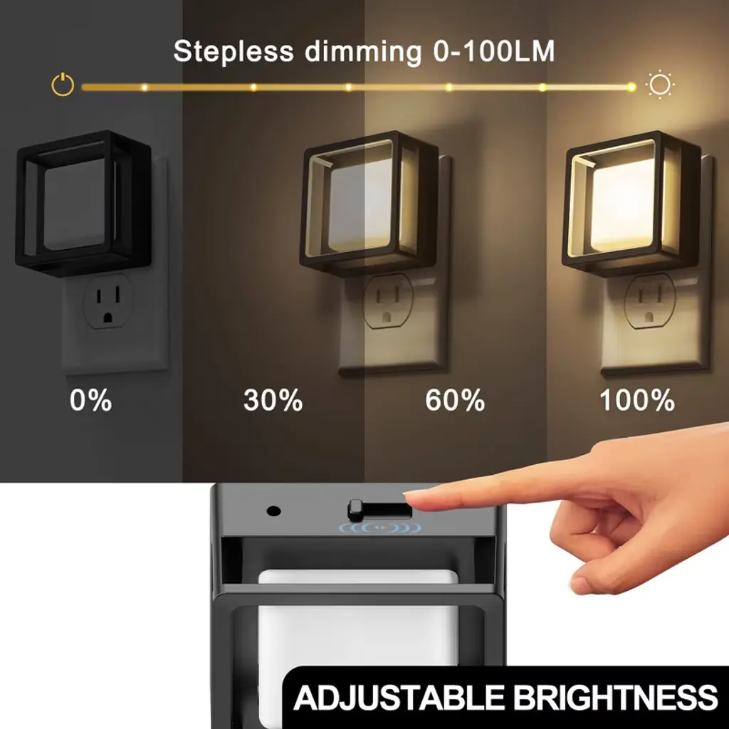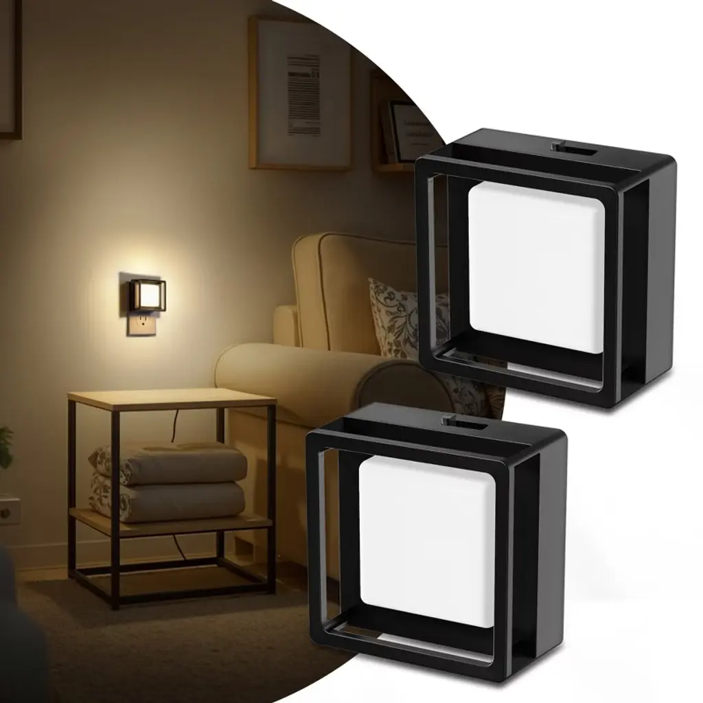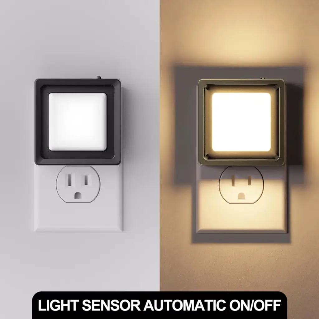 This 2-pack of 1W plug-in night lights features a small black decorative housing inspired by Philips-style design, perfect for bedrooms, hallways, or nurseries. Each light emits 3000K warm white illumination and includes a sliding dimmer for adjustable brightness from 0% to 100%. The built-in light sensor automatically turns the lights on in low light and off during the day, providing energy-efficient, hands-free operation.