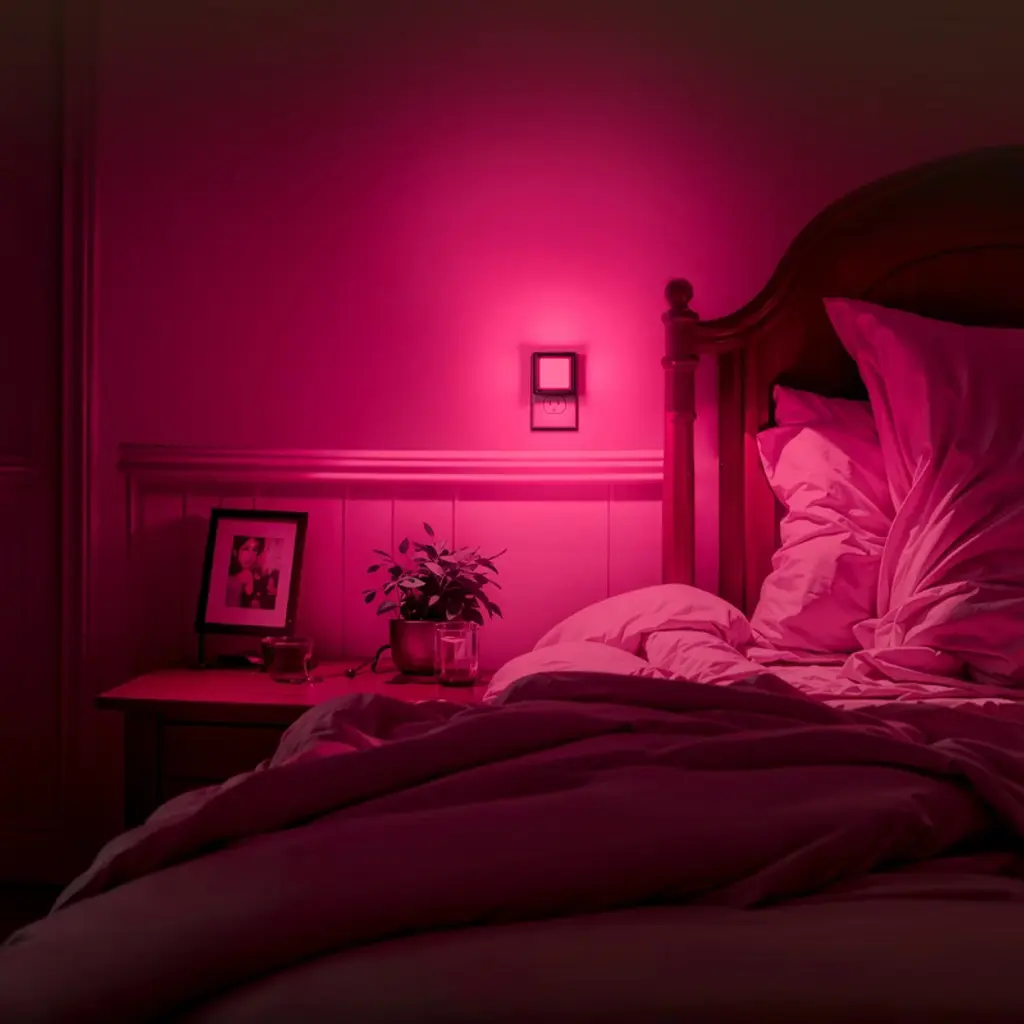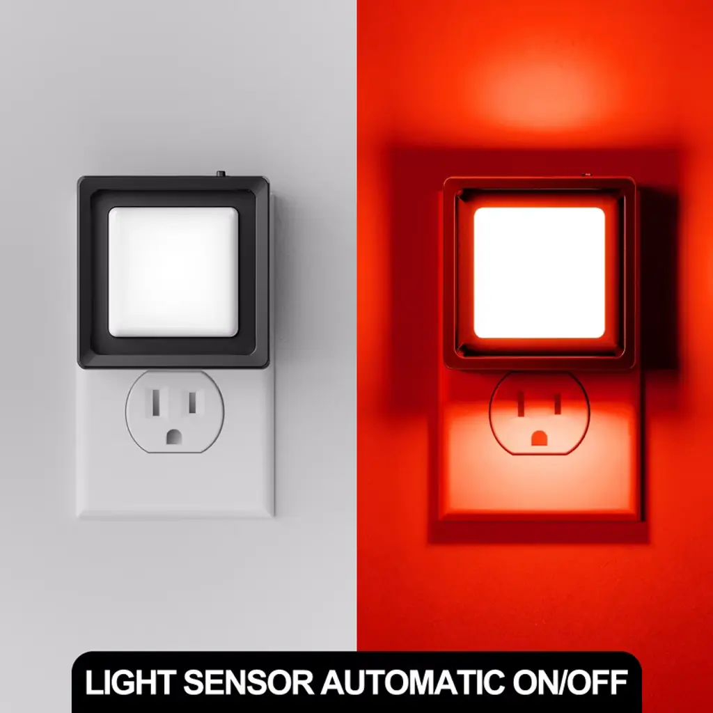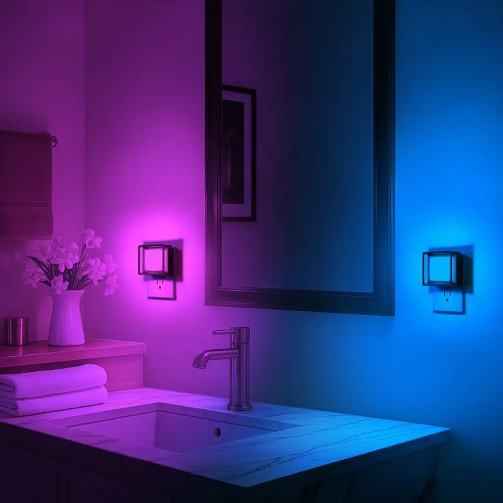 This 2-pack of 1W plug-in night lights features small black housings inspired by Philips-style design, ideal for bedrooms, hallways, or nurseries. Each light emits 3000K warm white and offers full RGB color options, allowing users to switch colors easily via button control. The built-in light sensor automatically turns the lights on in low light and off during the day, providing hands-free, energy-efficient operation.