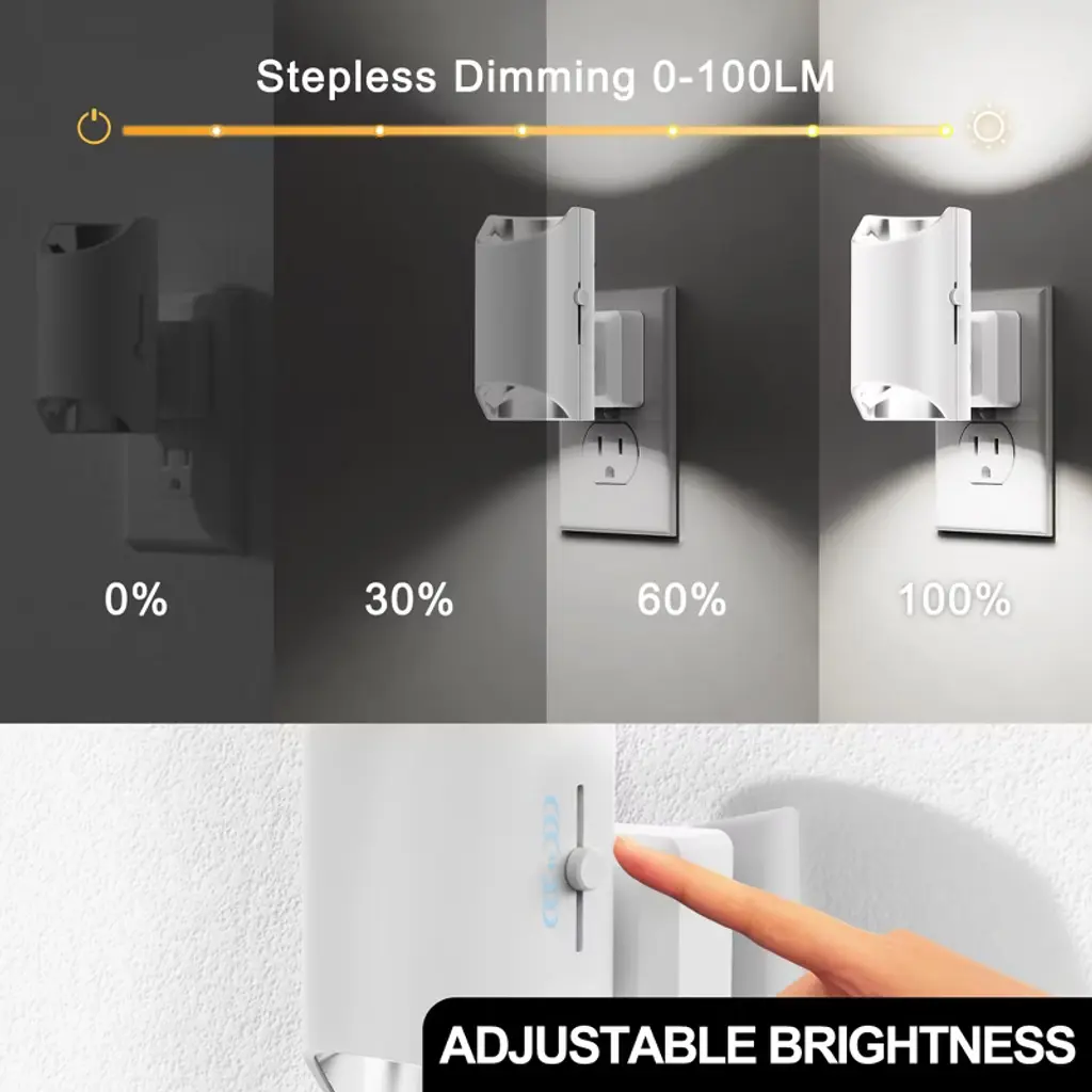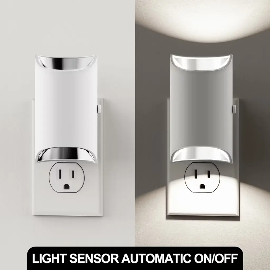 This 2-pack of 1W plug-in night lights features small black housings inspired by Philips-style design, ideal for bedrooms, hallways, or nurseries. Each light emits 3000K warm white and offers full RGB color options, allowing users to switch colors easily via button control. The built-in light sensor automatically turns the lights on in low light and off during the day, providing hands-free, energy-efficient operation.