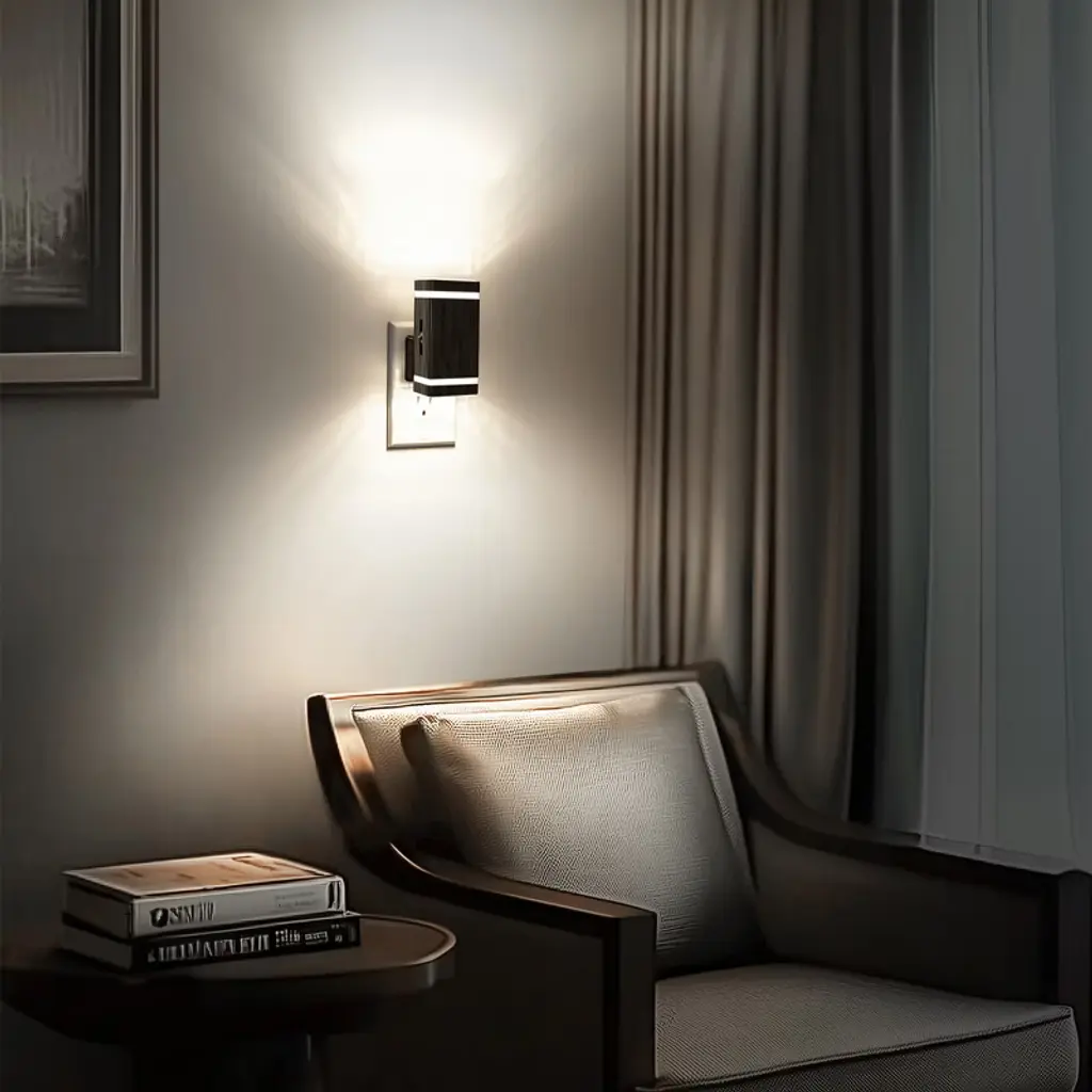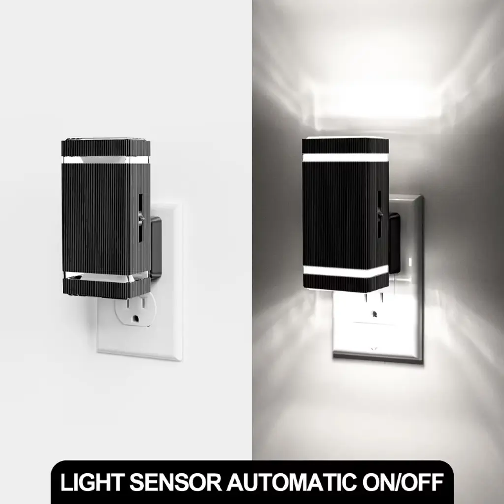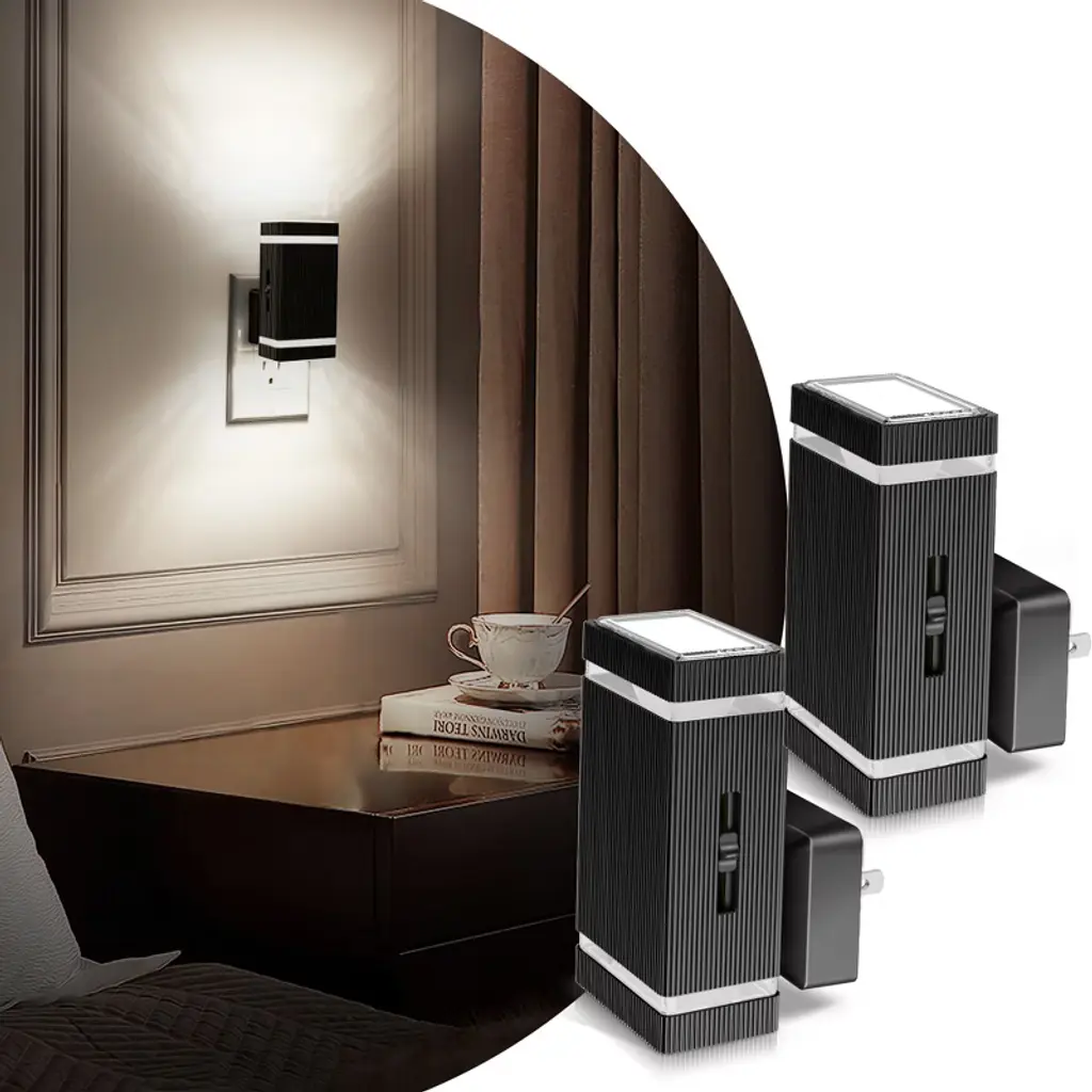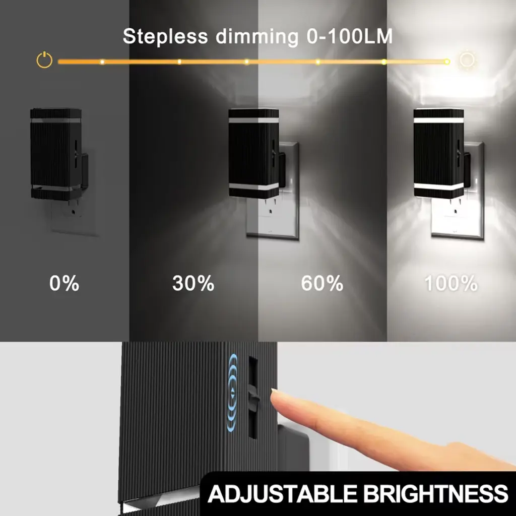 This 4-pack of plug-in night lights features frosted square covers and a sleek black housing, perfect for bedrooms, hallways, or nurseries. Each light operates at 1W with 5000K daylight for bright, clear illumination. The built-in sliding dimmer allows adjustable brightness from 0% to 100%, while the plug-in Light sensor automatically turns on in darkness and off during the day.