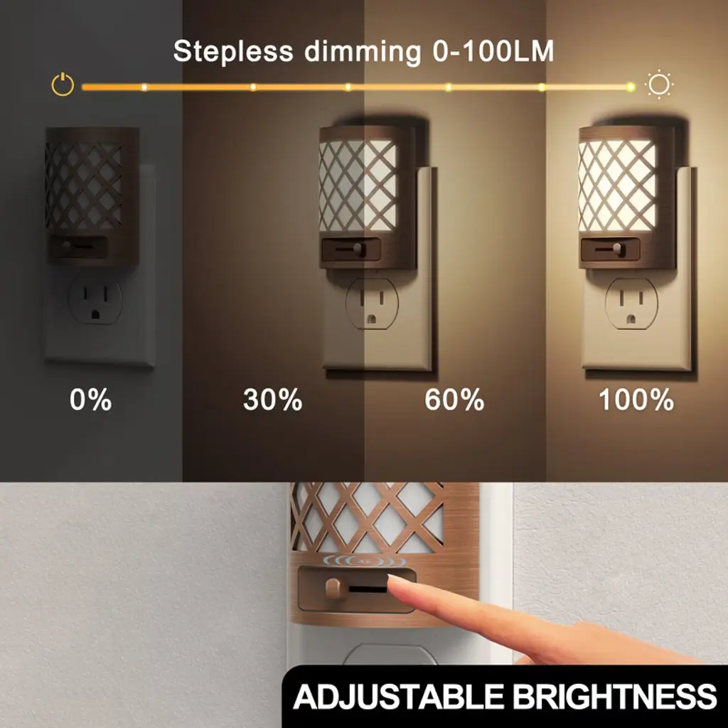 This 4-pack of 1W plug-in night lights features a retro-inspired design with warm 3000K illumination, ideal for bedrooms, hallways, or decorative spaces. Each light includes a sliding dimmer that allows brightness adjustment from 0% to 100%, giving users full control over the lighting intensity. The built-in light sensor automatically activates the lights in low light and turns them off during daylight, providing convenient, energy-efficient operation.