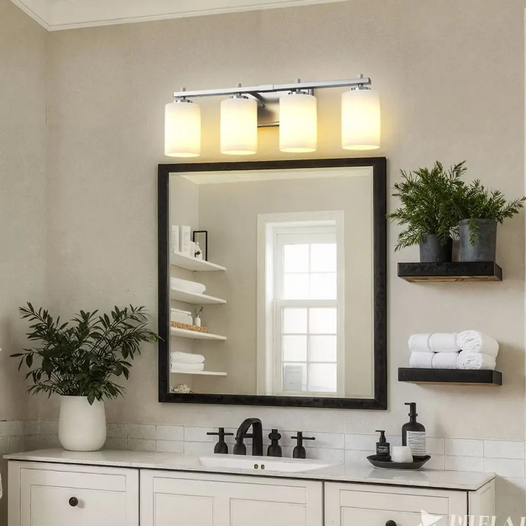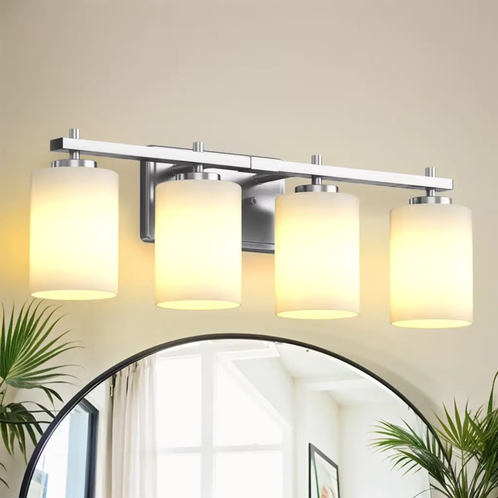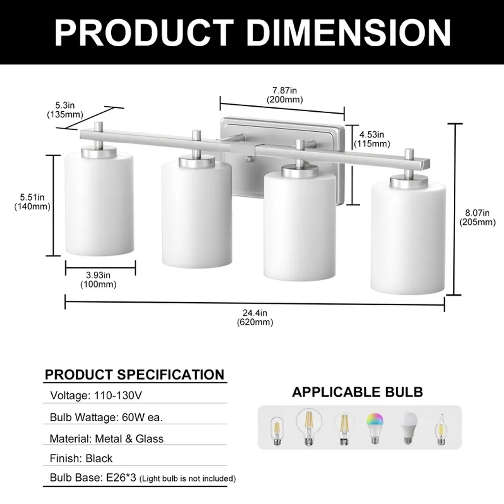 Enhance your space with this modern 4-light vanity wall lamp, designed to combine sleek style and practical functionality. Featuring a sand nickel finish and opal glass shades, this lamp adds a soft, diffused light to any room. The E26 socket accommodates standard bulbs (bulbs not included), allowing you to customize your lighting to suit your needs. Perfect for bathrooms, bedrooms, or above dressing mirrors, this wall lamp provides bright, even lighting for grooming and decor. Its durable metal and glass construction ensures long-lasting performance, while the square straight-arm design adds a contemporary touch. Easy to install and versatile in use, this wall lamp is a stylish and functional addition to any home.