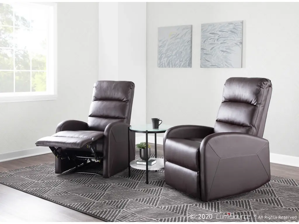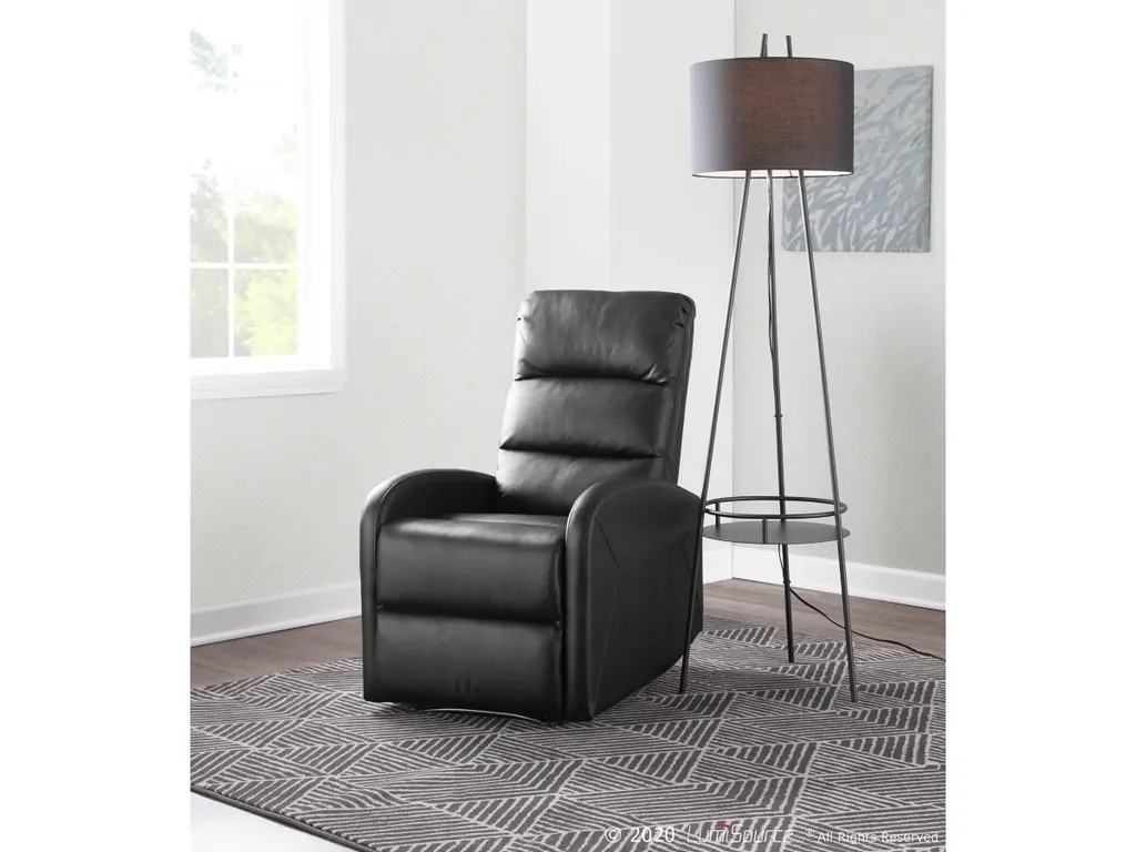 The Dormi Recliner by LumiSource adds style and comfort to any living space with a contemporary silhouette and faux leather upholstery. This comfortable recliner includes foam padding, a tufted seat and backrest, and easy manual recline. Available in a variety of upholstery colors, choose the one that fits your space the best.