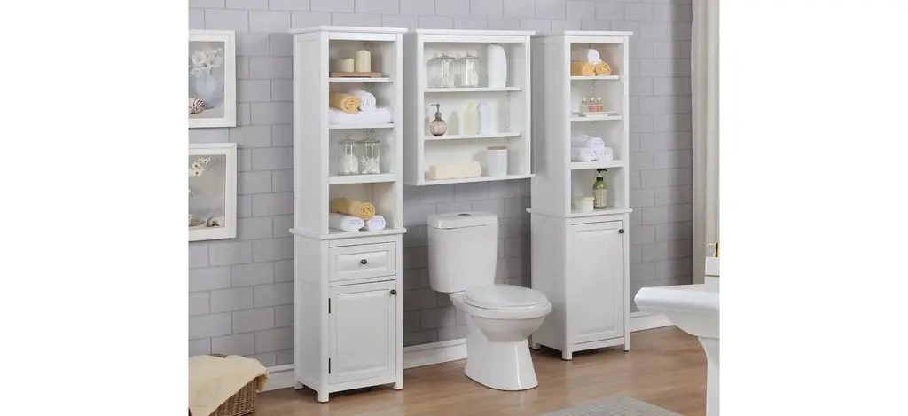 The Dorset Wall-Mounted Open Shelf Storage Cabinet provides storage and display to your space, designed for both style and functionality. Store toiletries, stacked washcloths, rolled towels, or anything you need to keep organized.