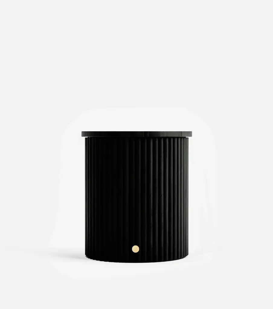 This striking vertical dresser, with a cylindrical plywood structure and 7 drawers for storage, has a dark walnut veneer and brushed gloss finish and rests on an inset plinth base. The fabric-lined drawers, sliding on soft metal runners and adorned with handles in burnished brass, have a walnut veneer except the top one, which is covered in grosgrain design brown leather. Topped with a magnificent Emperador marble top with complementing dark gray and brown hues, this elegantly designed piece is specifically designed for the bedroom, but can find space also in a living room or entryway.