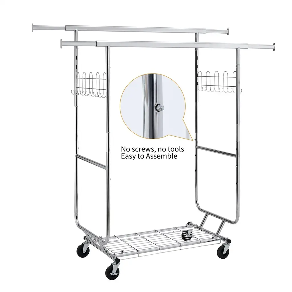 Double Clothing Garment Rack With Shelves, Wheels Rolling - Silver
