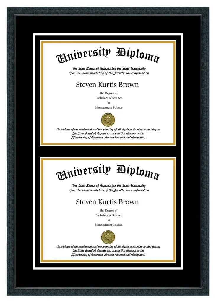 Proudly display your achievement with our Double Diploma Frame with Double Matting. This frame comes with your choice of moulding and crystal clear glass protection. We have several hardwood moulding options that have beautiful finishes. This frame also comes with Black over Gold mat board colors. Our last option is with our glass protection. We have standard clear glass and an upgraded Conservation Glass that provides museum quality 99% UV protection.
