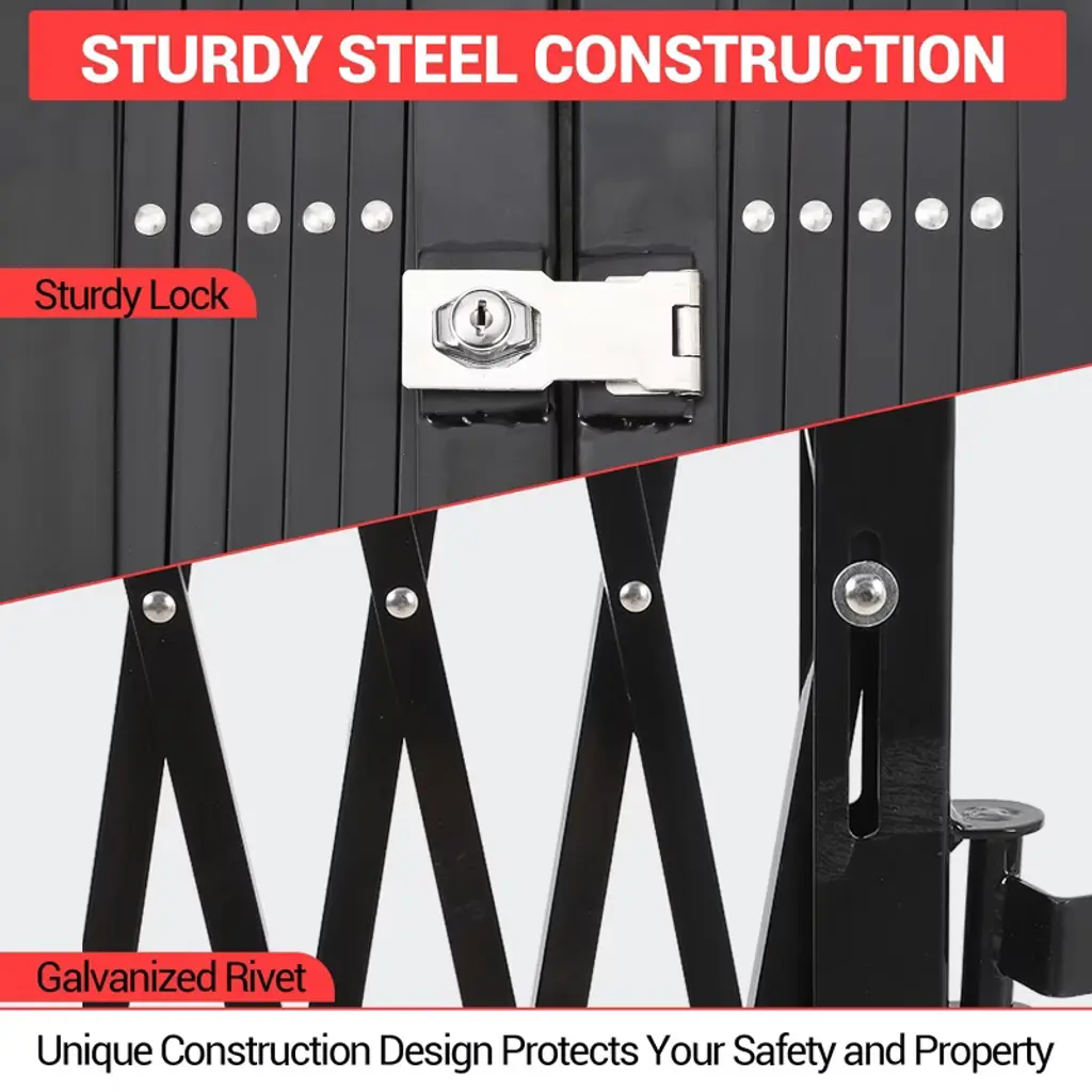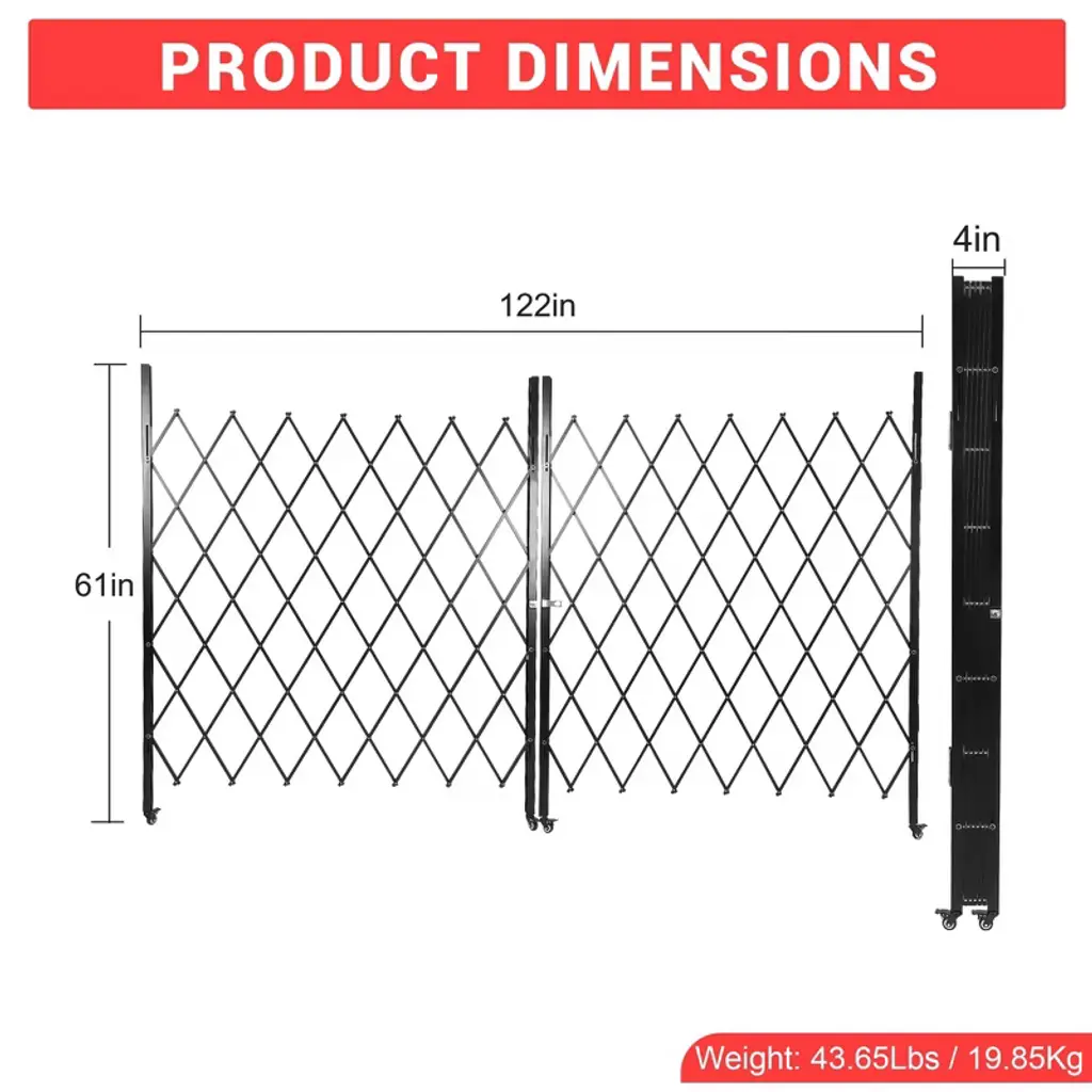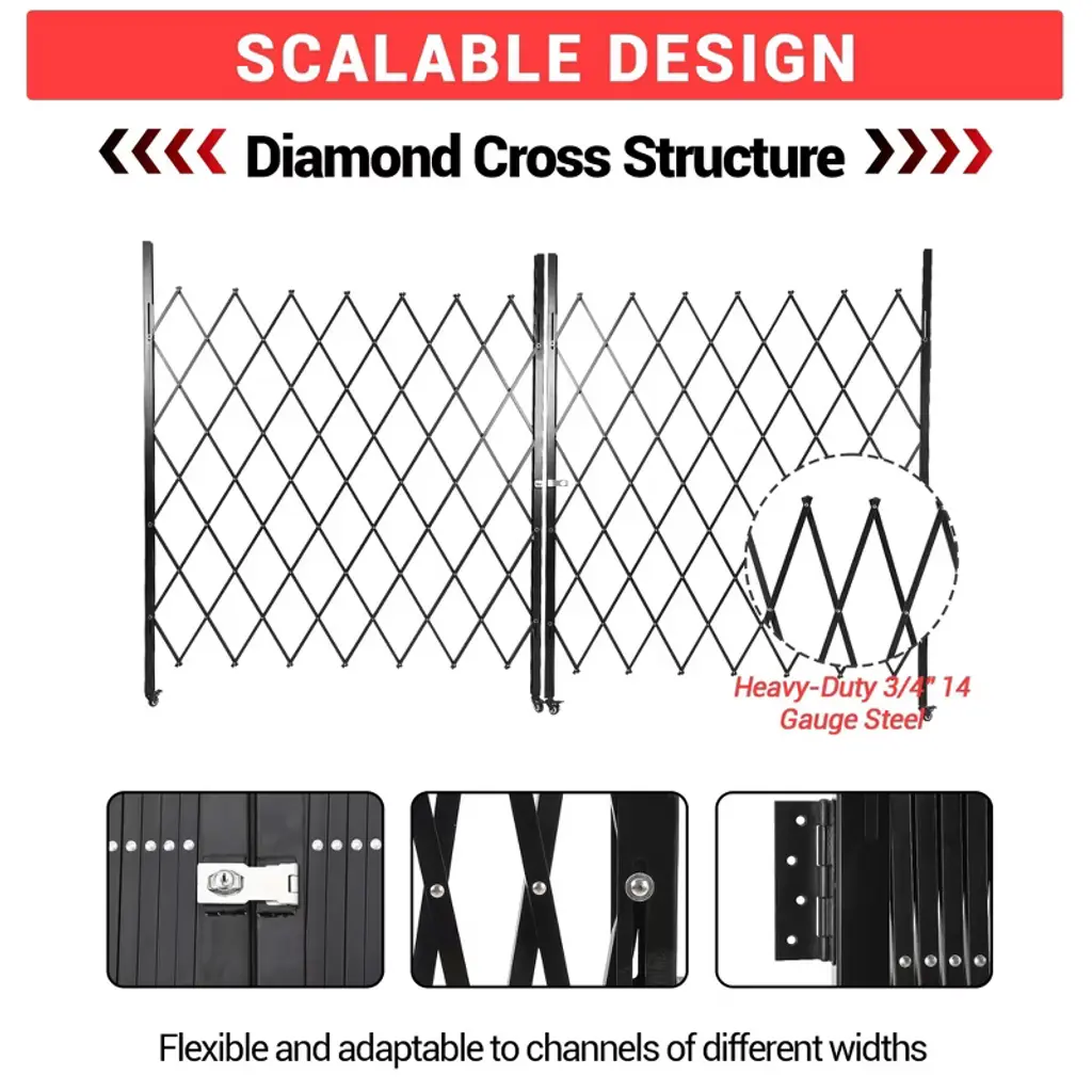 **Heavy-Duty Expandable Security Gate with Locking Casters**Product Specifications:- Material: 3/4" 14-Gauge Steel Channel Construction- Available Sizes: 85"H x 150"W, 61"H x 122"W, 50"H x 75"W, 50"H x 67"W, 50"H x 43"W, 61"H x 71"W- Finish: Protective Black Powder-Coating- Special Features: 360¡ã Locking Casters, Integrated Padlock System, Tool-Included Setup- Weight Capacity: Industrial-Grade Load BearingKey Features:1. **Multi-Size Adaptive Configuration** Available in six size variations (85"H x 150"W to 50"H x 43"W) to perfectly secure openings of different dimensions. The scissor-style expansion mechanism ensures tight fitment for driveways, warehouses, and commercial entryways without custom installation.2. **Industrial-Strength Steel Construction** Fabricated from robust 3/4" 14-gauge steel channel with reinforced cross-bracing for maximum security. The anti-impact design features rust-resistant powder-coating that withstands weather elements and attempted intrusions, providing long-term property protection.3. **Smooth Mobility with Positive Locking** Four 360¡ã swivel casters enable effortless movement and positioning by a single person. Each caster includes individual locking mechanisms that securely anchor the gate in place, preventing unintended displacement while maintaining full mobility when needed.4. **Integrated High-Security Locking System** Comes complete with built-in padlock hasp and included high-security padlock with keys. The instant-locking design allows for quick securing in expanded position, preventing unauthorized access while maintaining visible deterrence and ventilation.5. **Universal Commercial/Residential Application** Provides physical security for large industrial driveways, warehouse access points, and commercial storefronts, while equally suitable for residential garages, pool areas, and basement security. The open-barrier design maintains visibility and airflow while creating effective access control.Included Components:- 1 x Expandable Security Gate- 4 x 360¡ã Locking Casters- 1 x High-Security Padlock with Keys- All Necessary Installation HardwareNote: Professional-grade security solution requiring minimal maintenance. Powder-coated finish ensures durability in outdoor conditions. Suitable for both temporary and permanent security applications.