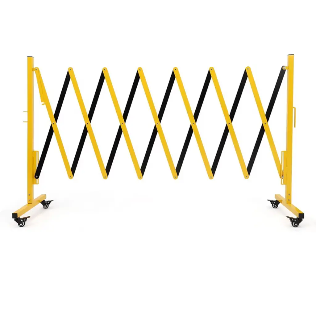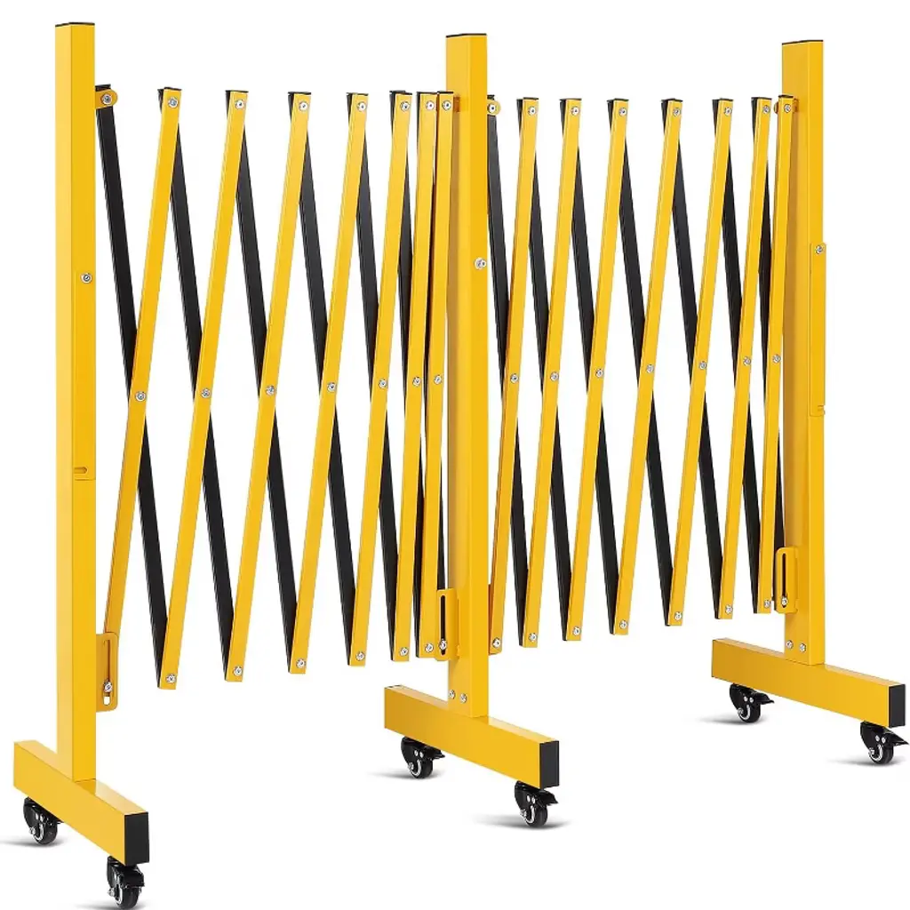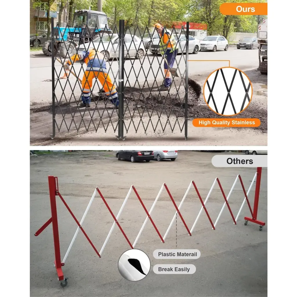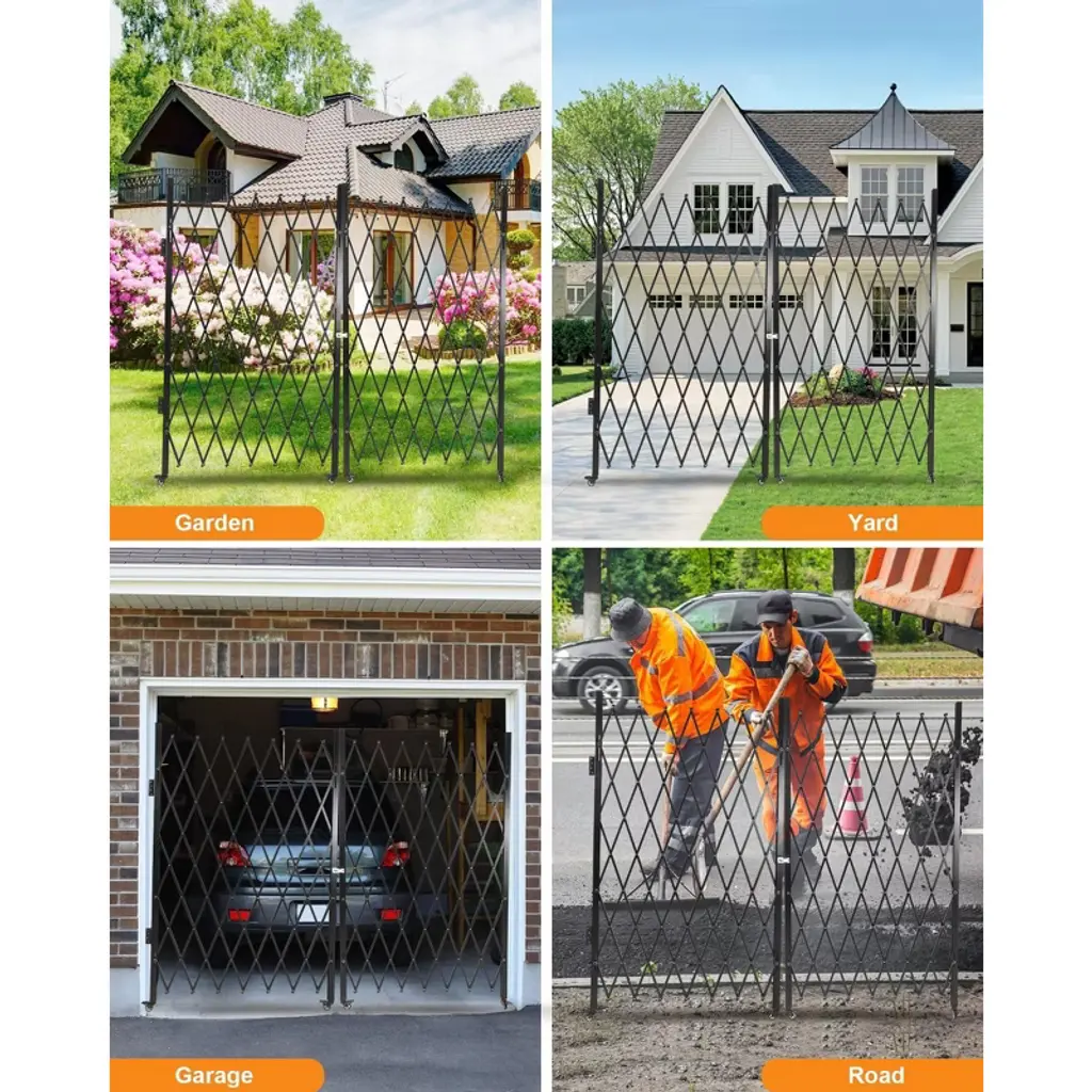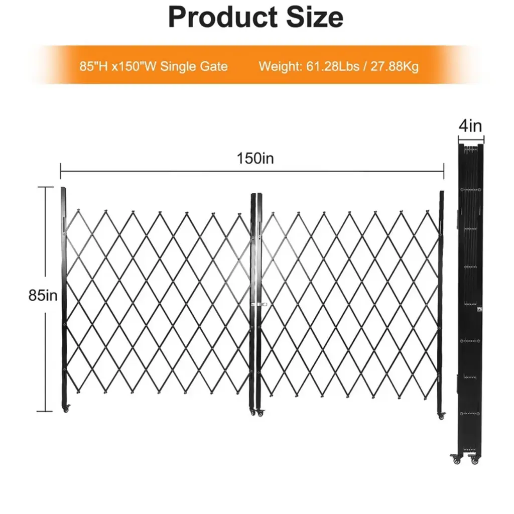 **Expandable Folding Security Gate with Locking Wheels**Product Specifications:- Material: Reinforced Iron Frame + Aluminum Alloy Mesh- Maximum Expanded Dimensions: 50" Height x 67" Width- Folded Dimensions: Compact for Storage- Item Weight: 62.2 lbs- Special Features: Adjustable Width, 360¡ã Locking Casters, Tool-Free Assembly- Color: MetallicKey Features:1. **Adjustable Space-Efficient Design** Features a retractable width mechanism that expands up to 50" H x 67" W for flexible coverage, then folds compactly when not in use. Ideal for driveways, storefronts, and creating temporary security zones without permanent installation.2. **Industrial-Grade Durability** Constructed with a sturdy iron frame and reinforced aluminum alloy mesh that resists compression, impact, and deformation. Built to maintain structural integrity in high-traffic areas while providing reliable long-term security.3. **Enhanced Mobility with Secure Locking** Equipped with four 360¡ã swivel casters featuring individual locking mechanisms for effortless movement and fixed positioning. Enables quick repositioning while ensuring stable placement when secured.4. **Quick-Deployment Security Solution** Offers tool-free installation and user-friendly locking mechanisms for immediate setup. Provides instant security for various applications including warehouses, construction sites, and residential areas without requiring technical expertise.5. **Versatile Protective Barrier** Serves multiple functions across residential, commercial, and industrial settings. The open mesh design maintains visibility and airflow while providing security for garages, retail spaces, basements, and industrial zones without creating visual obstruction.Included Components:- 1 x Foldable Security Gate- Locking Caster System- All Necessary Hardware