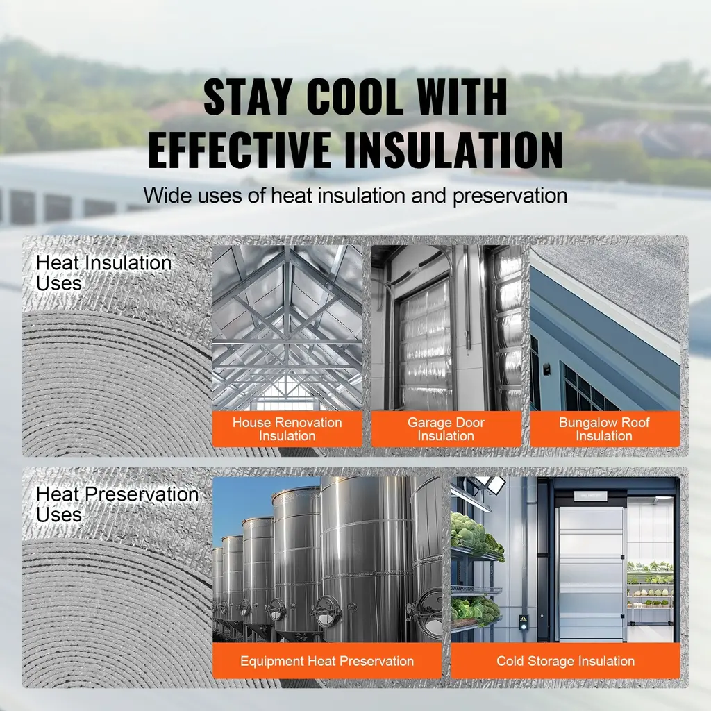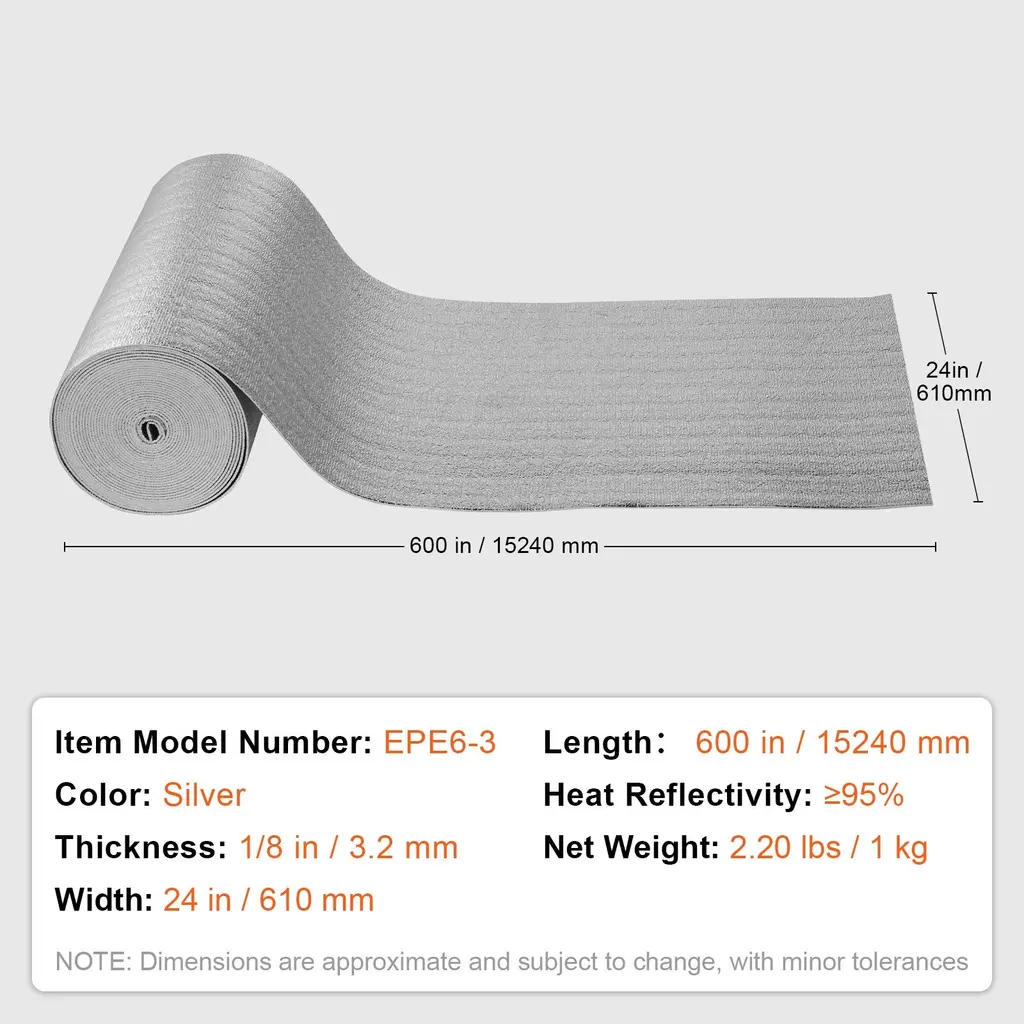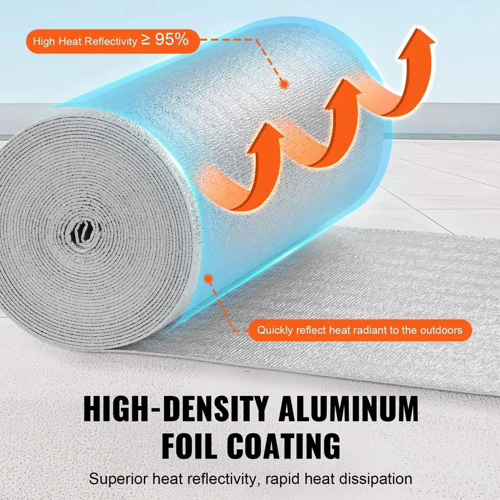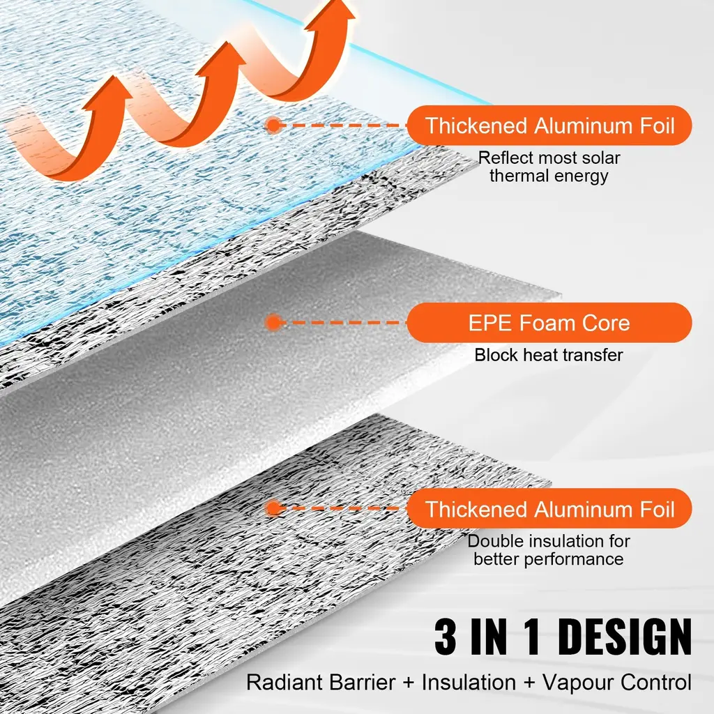 3-in-1 Design: Our 50 ft x 48 in / 50 ft x 23.8 in / 25 ft x 48 in / 25 ft x 24 in double reflective insulation roll features a versatile 3-in-1 design: Radiant Barrier + Insulation + Vapour Control, ensuring exceptional thermal performance. Excellent radiant barrier keeps you cool in summer and warm in winter, maintaining a comfortable indoor temperature year-round. Premium Materials: Crafted from double reflective aluminum foil and high-density EPE foam core, our 3.2 mm thick heat reflective insulation roll efficiently reflects sunlight and blocks heat transfer in summer, while preventing indoor heating loss in winter. Stay cool in summer, keep warm in winter! Reflects Over 95% of Heat: Featuring high-density aluminum foil coating with outstanding heat reflectivity, this double reflective foam core radiant barrier efficiently reflects more than 95% of solar heat. Experience rapid heat dissipation, keeping your space cool and comfortable during hot days. Easy Installation: This double-sided aluminum foil insulation roll is easy to cut and install. It is convenient to DIY the roll size and shape to meet your different needs. When not in use, it can be easily folded up for space-saving and convenient carrying. Versatile Applications: Our thermal insulation heat shield is tear and puncture-resistant, scratch and wear-resistant, strong and lightweight. It's perfect for windows, garage doors, RVs, houses, roofs, etc, offering effective heat blocking and insulation wherever needed. Package Content 1 x Double Reflective Insulation Roll