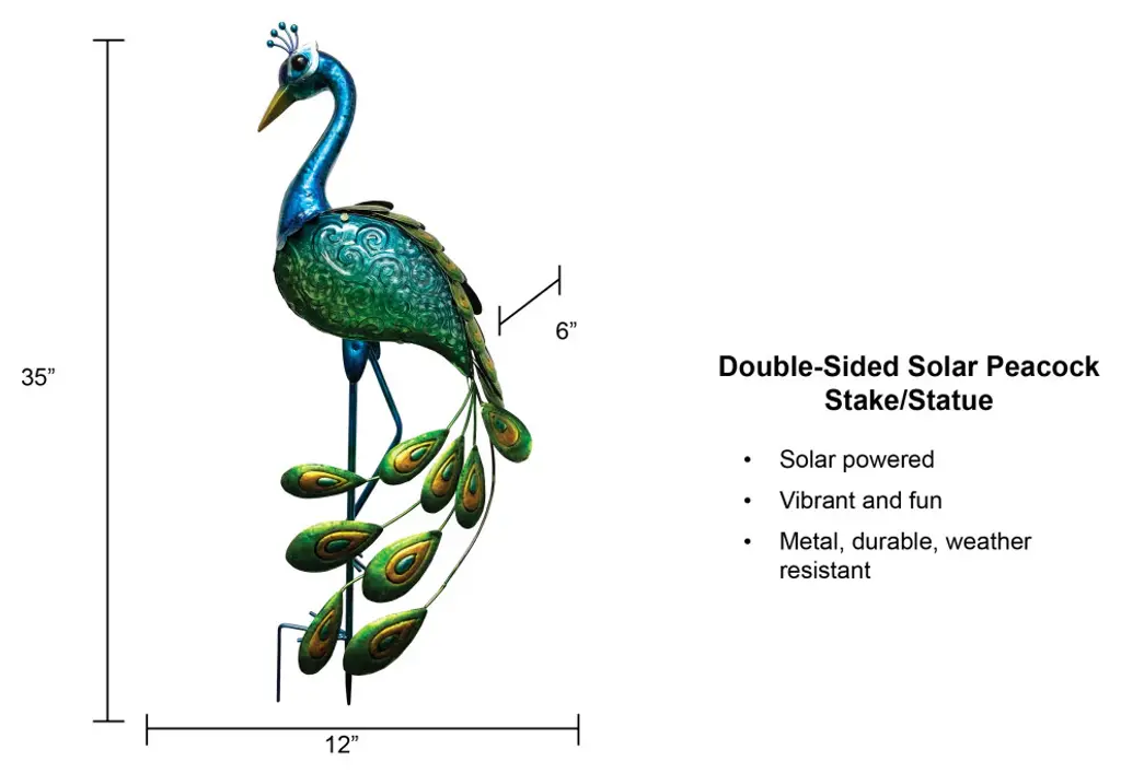 This beautiful and intricately designed peacock stake is functional both during the day and night. During the day it is an eye catching and vibrant statue while at night it doubles as a solar-powered light, keeping your yard well-lit at night.