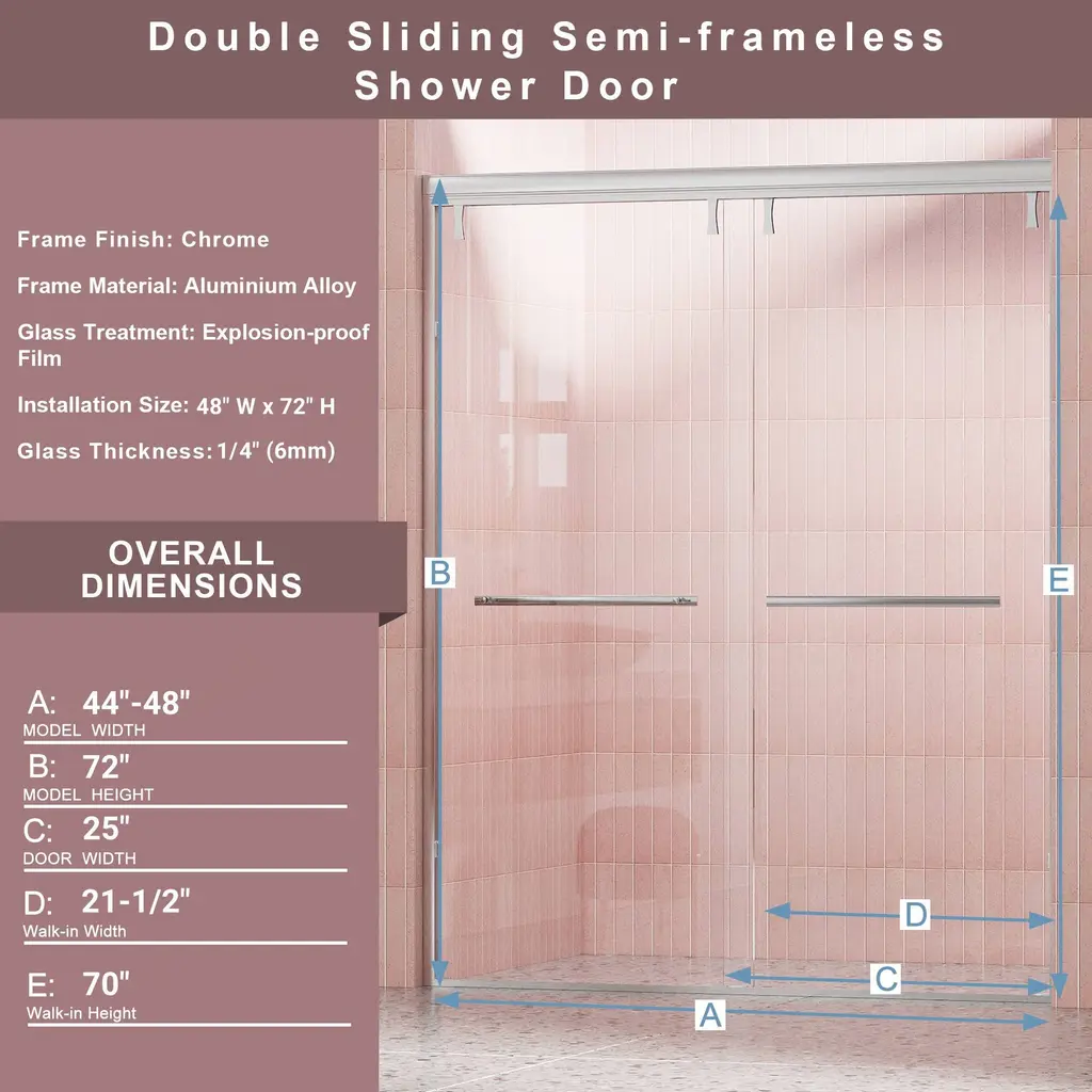 Double Sliding Framed Shower Door With Clear Tempered Glass - 48" X 72" - Chrome