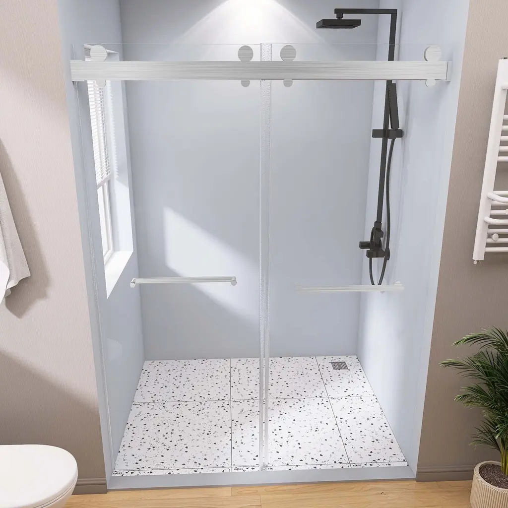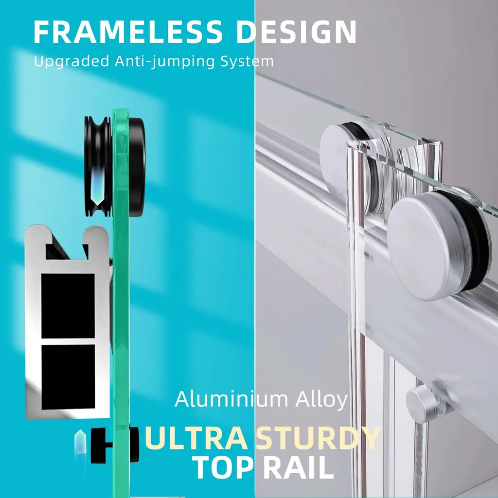 The adjustable width of this frameless sliding door makes it suitable even for small spaces. The reversible door of the shower slides to the right or the left, depending on your preference. With this sliding shower door, taking a bath or shower become available. Other hardwares are made of high-quality anti-rust 304 stainless steel. This shower door is durable and sturdy. These sliding shower doors with bottom/side seal strip effectively prevents splashes and leaks from escaping the enclosure, hence keeping the rest of your bathroom dry. When installing the pulley, pay attention to whether the pulley is tightened on the glass, especially the pulley on the sliding glass, to prevent the pulley from loosening and the glass door from falling. And the glass cannot be cut. All the accessories of this frameless shower door are made premium. Stainless steel top guide bar has strong corrosion resistance and can be cut and adjusted according to the door width.