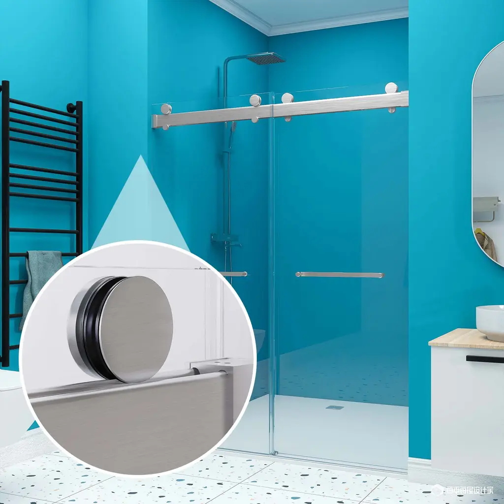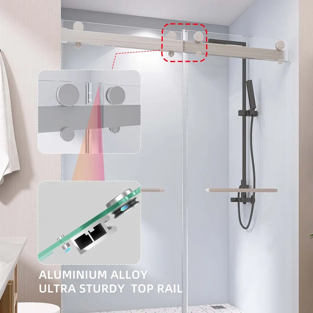 The adjustable width of this frameless sliding door makes it suitable even for small spaces. The reversible door of the shower slides to the right or the left, depending on your preference. With this sliding shower door, taking a bath or shower become available. The glass shower door is 3/8 inch thick tempered crystal glass, ANSI certified, safety and durable. Other hardwares are made of high-quality anti-rust 304 stainless steel. This shower door is durable and sturdy. These sliding shower doors with bottom/side seal strip effectively prevents splashes and leaks from escaping the enclosure, hence keeping the rest of your bathroom dry. When installing the pulley, pay attention to whether the pulley is tightened on the glass, especially the pulley on the sliding glass, to prevent the pulley from loosening and the glass door from falling. And the glass cannot be cut. All the accessories of this frameless shower door are made premium. Stainless steel top guide bar has strong corrosion resistance and can be cut and adjusted according to the door width.