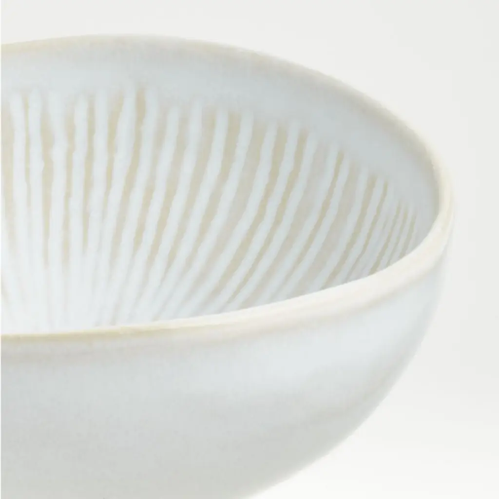 Countless perfectly imperfect lines texture the exterior of this white mini bowl with the look and feel of artisan ceramics. A filmy white glaze washes over the bowl, pooling opaque in the crevices and filming the raised surfaces to show the warm color of the base clay. The oven-safe stoneware bowl serves everything from marinated olives to hot pepper jelly to diced chives, and cleans up easily in the dishwasher. Part of our Dover white dinnerware collection, the mini bowl is a Crate and Barrel exclusive.