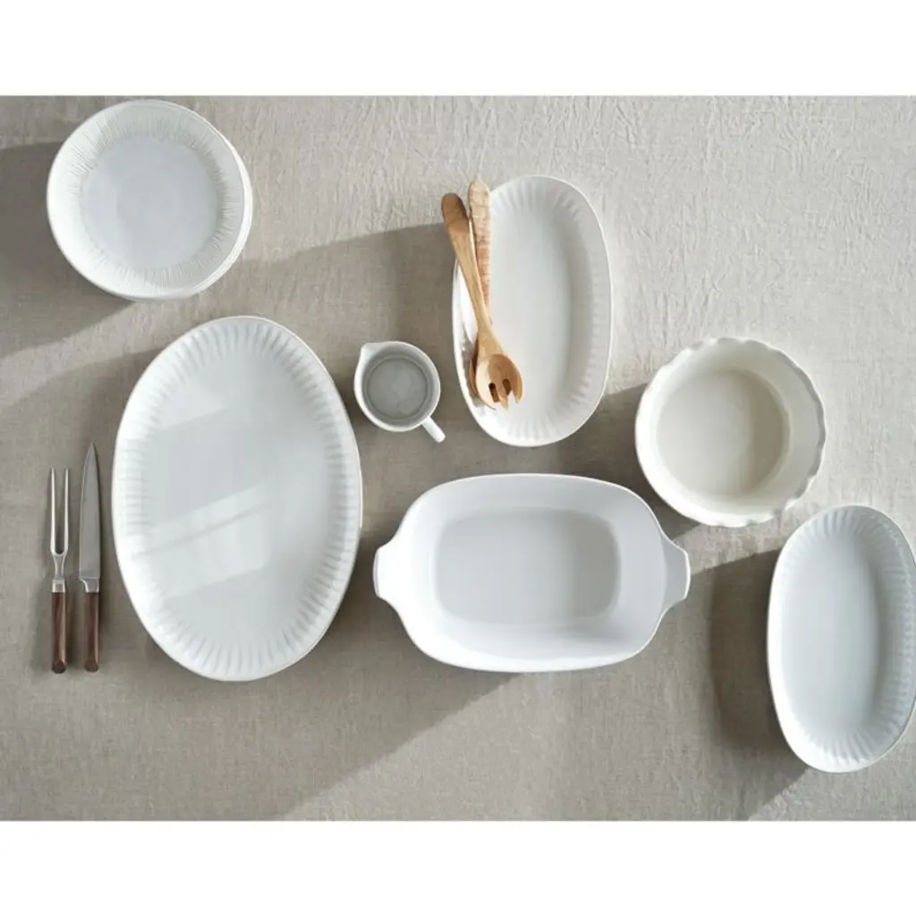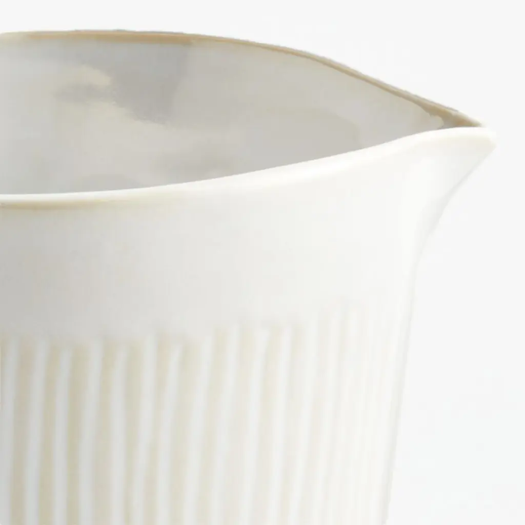Countless perfectly imperfect lines texture the exterior of this white sauce pot with the look and feel of artisan ceramics. A filmy white glaze washes over the petite pitcher, pooling opaque in the crevices and filming the raised surfaces to show the warm color of the base clay. The oven-safe stoneware vessel serves everything from gravy to salad dressing to crème anglaise, and cleans up easily in the dishwasher. Part of our Dover white dinnerware collection, the sauce pot is a Crate & Barrel exclusive.