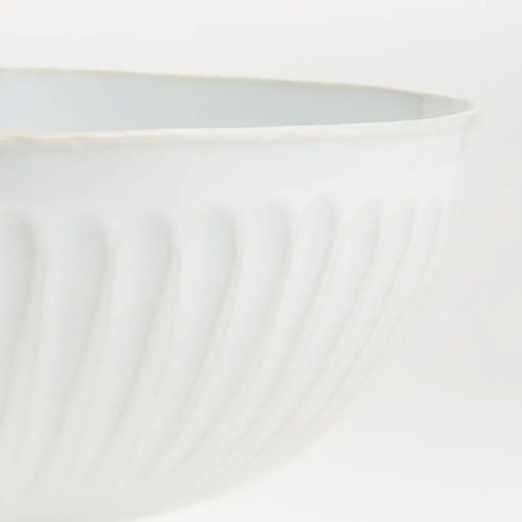 A ring of deep indentations texture the interior of this white serving bowl with the look and feel of a handcrafted ceramic piece. A filmy white glaze washes over the bowl, pooling opaque in the crevices and filming the raised surfaces to show the warm color of the base clay. This oven-safe stoneware bowl serves everything from grain salads to stir-frys to vanilla bean custard and cleans up easily in the dishwasher. Part of our Dover white dinnerware collection, the serving bowl is a Crate and Barrel exclusive.