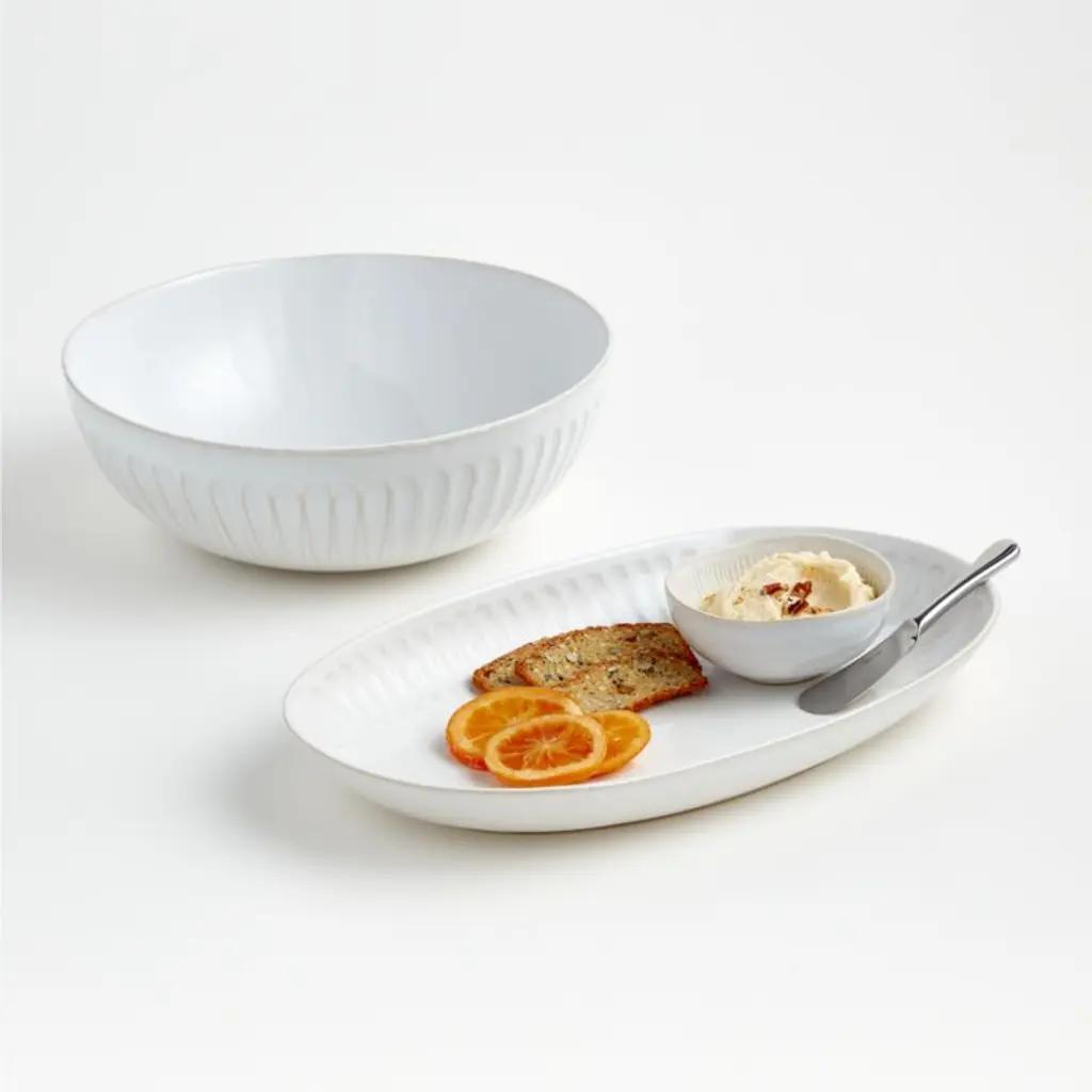Deep indentations ring this white platter with the look and feel of a hand-textured ceramic piece. A filmy white glaze washes over the bowl, pooling opaque in the crevices and filming the raised surfaces to show the warm color of the base clay. This oven-safe stoneware serving plate presents appetizers, roasted meats and heaps of fresh fruits, and cleans up easily in the dishwasher. Part of our Dover white dinnerware collection, the oval platter is a Crate and Barrel exclusive.