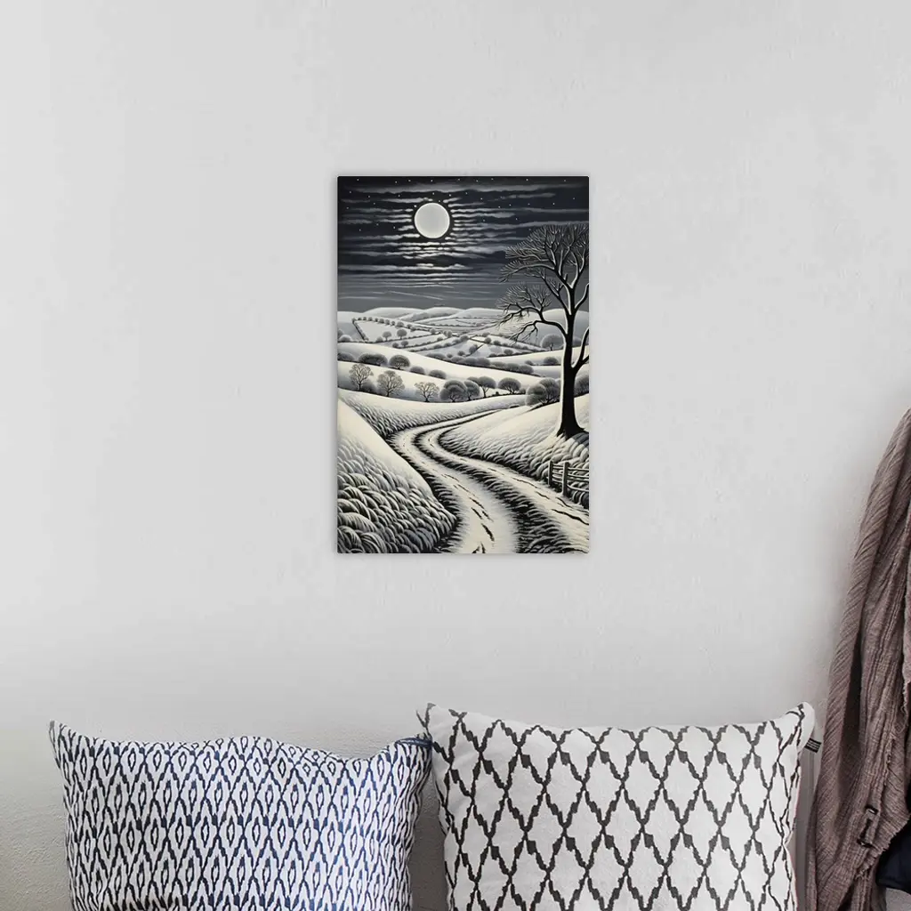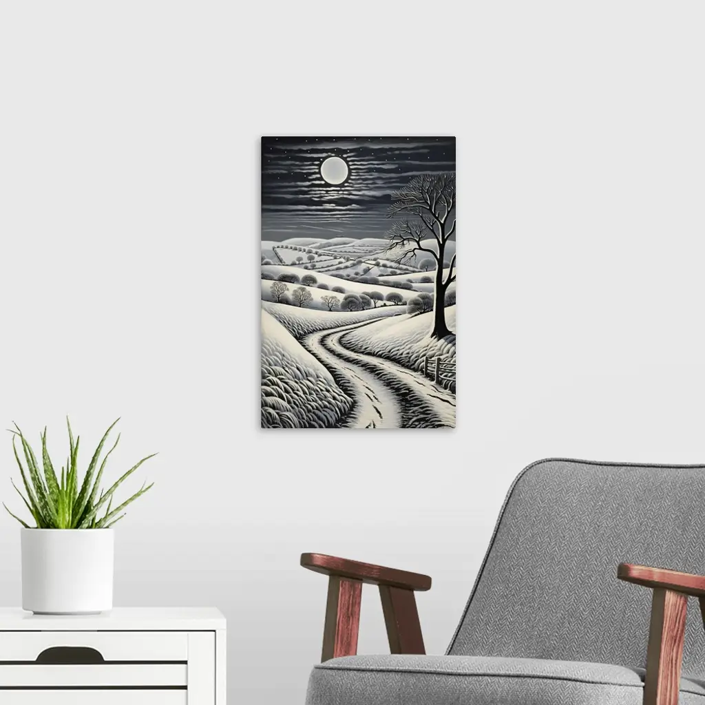 Footprints in the snow on a path on the Downs in West Sussex, England, UK. The moonlight illuminates the countryside during winter.