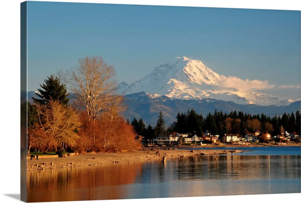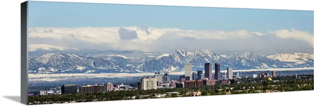 Chugach mountain range seen behind a wide angle view of downtown Anchorage with mudflats in the foreground.