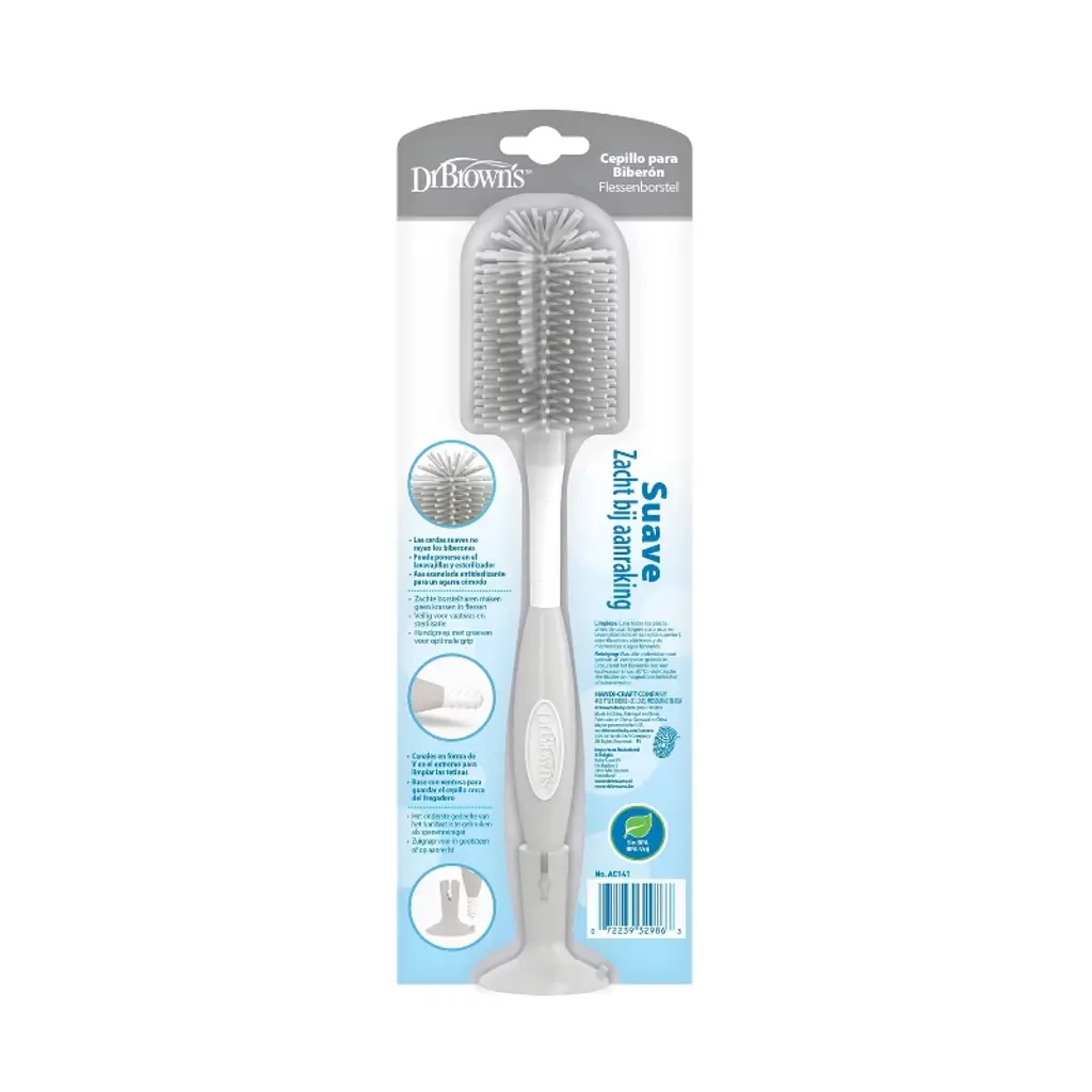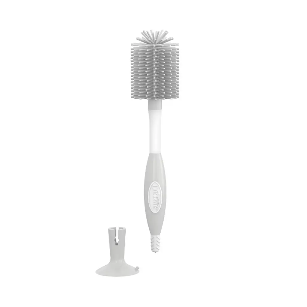 Gentle touch. Powerful cleaning. Scratch-free scrubbing meets durable design with synthetic rubber bristles on the Soft Touch Bottle Brush, giving you a thorough and efficient bottle cleaning experience. Get a solid grip on the no-slip grooved handle whether you’re using the bristle head or the specially designed ridged nipple cleaner in the base. Use the suction cup base for hygienic sink-side storage. The Dr. Brown’s Soft Touch Bottle Brush is completely metal-free, making it both dishwasher (top rack) and sterilizer safe. BPA free.