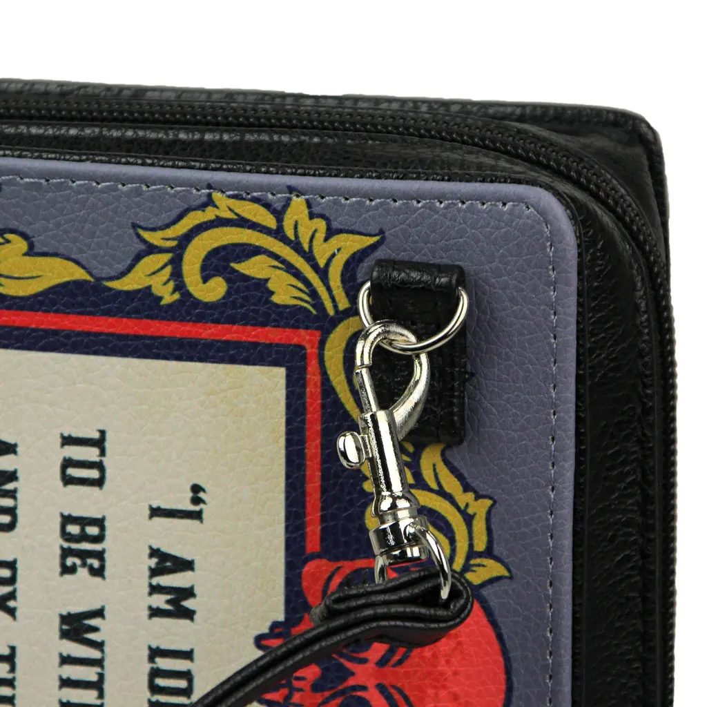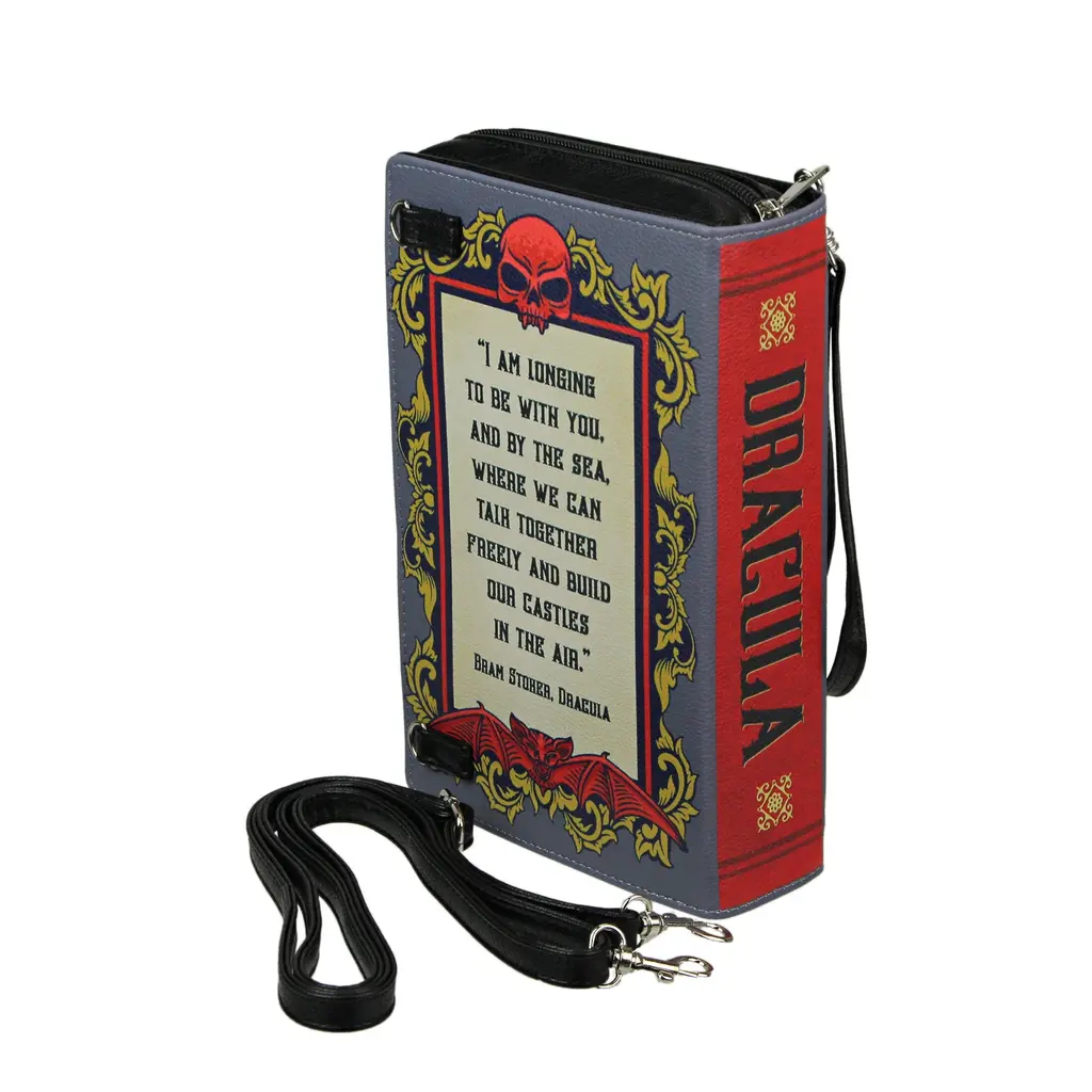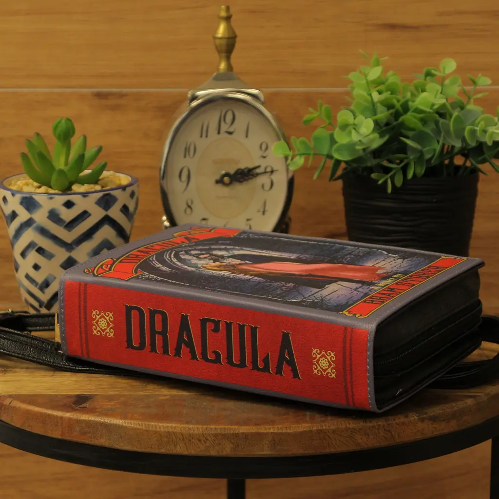 Embrace the dark allure of Gothic fiction with this exquisitely crafted, book-shaped bag, inspired by the haunting tale of Dracula. The bag features a captivating design in deep gray, accented with a striking red spine adorned with black lettering and shimmering gold details. The front and back showcase full-color prints, bringing Bram Stoker's macabre masterpiece to life, while the back bears a chilling quote from the novel, written in black lettering. Its textured vinyl material echoes the feel of ancient, leather-bound tomes, evoking the mysterious and the arcane. Inside, the bag offers a spacious, fabric-lined dual compartment, complete with a secure center zippered pocket for all your dark necessities. The zip-around closure ensures your items remain safely enclosed, much like the secrets within Dracula’s crypt. Measuring 9.25 inches long, 6 inches wide, and 2.5 inches high, this enchanting accessory is both stylish and functional. Choose between the 52-inch crossbody strap with a 26.5-inch drop or the wrist strap, allowing you to carry it elegantly, whether by moonlight or by day. This Gothic masterpiece is a stunning nod to Dracula's eternal legacy, making it the perfect companion for those who walk in the shadows of history and horror.