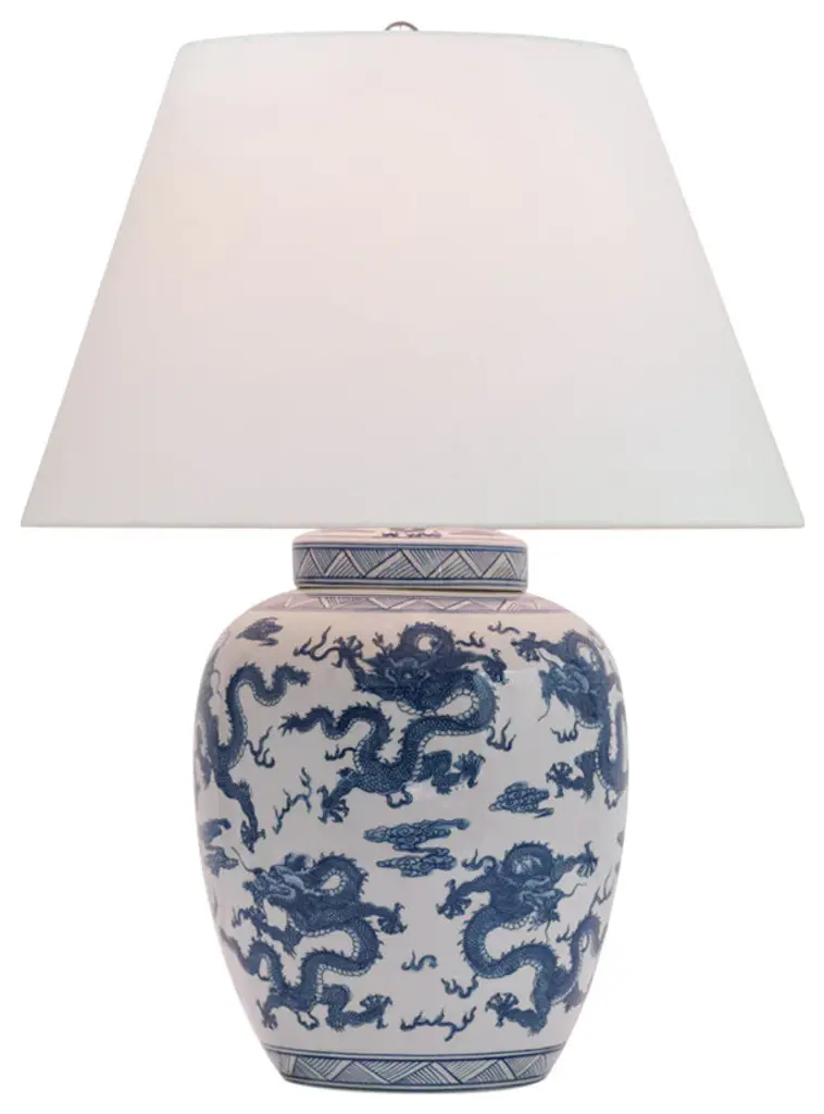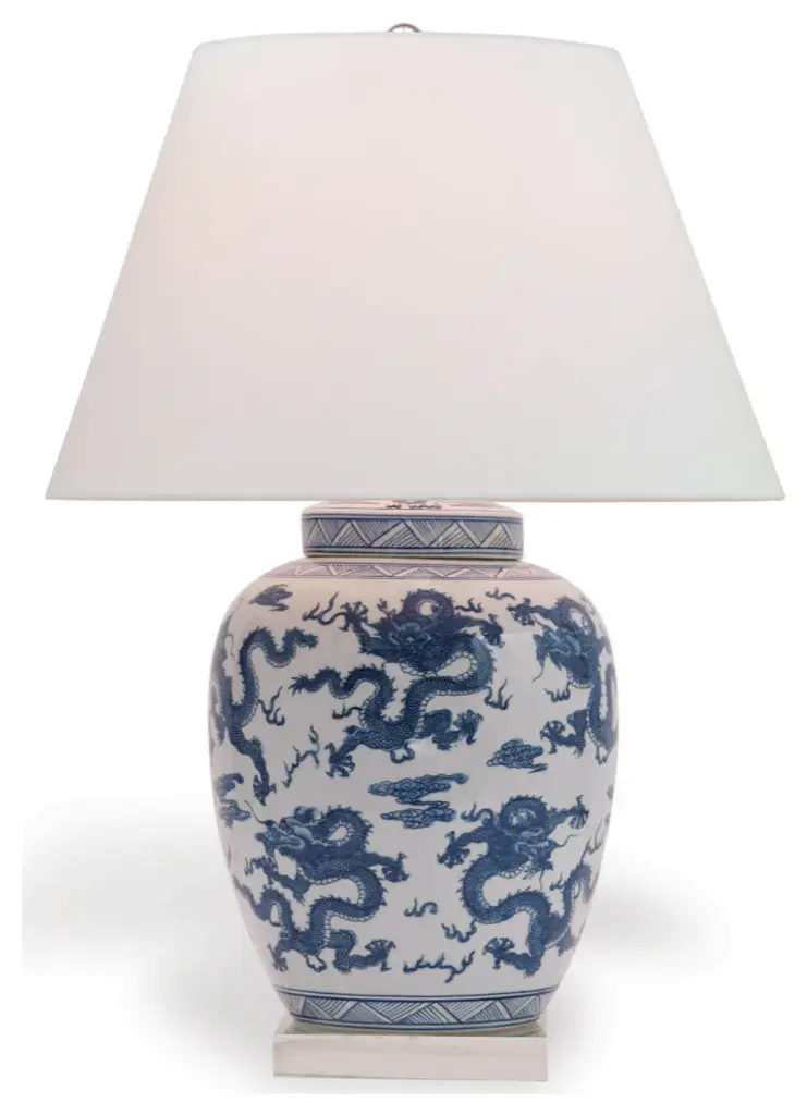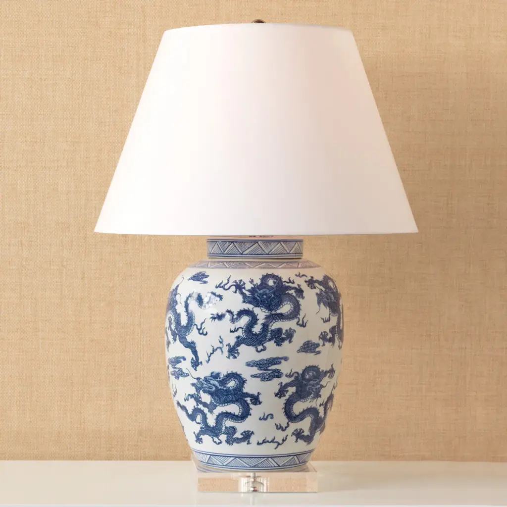 A timeless, Asian pattern of dragons surround our hand painted lamp. Featuring a square lucite base, our lamp is a modern classic with accents of nickel hardware. Metal ball finial. 3 way switch. 150 watt max bulb. Lightbulb not included. Shade: 11.5" x 20" x 13"SH. Tapered, hardback shade. Soft rolled edge. Nickel spider. Off white polyester fabric. Materials: porcelain, lucite
