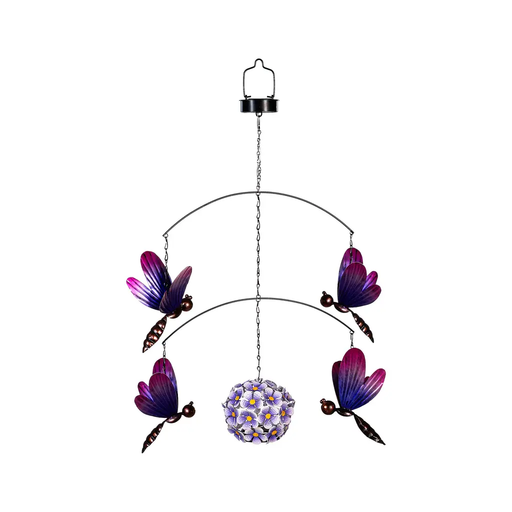 Beautify any space with this charming hanging mobile. The sweet design brings a joyful look to any space with its bright dragonfly accents. Durable construction with high-quality materials ensures it will last season after season. The solar lights glow at night. Perfect for any spot in need of some cheer. Hang it in the garden, yard, or on the porch to show it off. It makes a great gift for anyone looking to update their garden décor. It requires one AAA Ni-MH battery, included and it's adapter compatible.