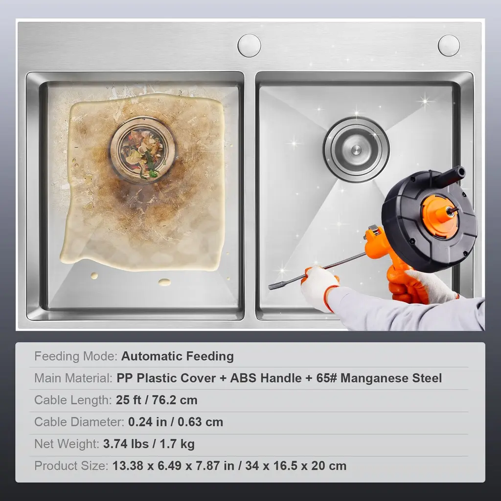 Drain Auger 25ft For Kitchen Bathroom Shower Sink With Protective Hose And Gloves - Automatic Feed
