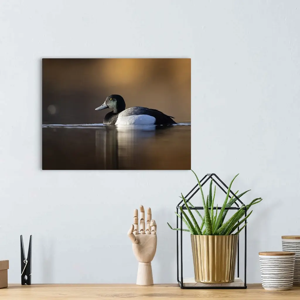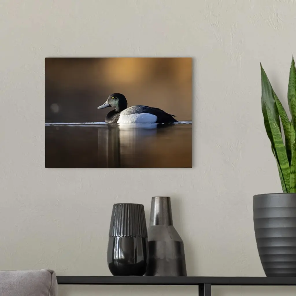 Drake greater scaup (Aythya marila) pauses on a Southcentral Alaska lake in early May. In good light, greater scaup drakes have a green sheen on their heads, distinguishing them from lesser scaup drakes which have purple sheens; Anchorage, Alaska, United States of America.