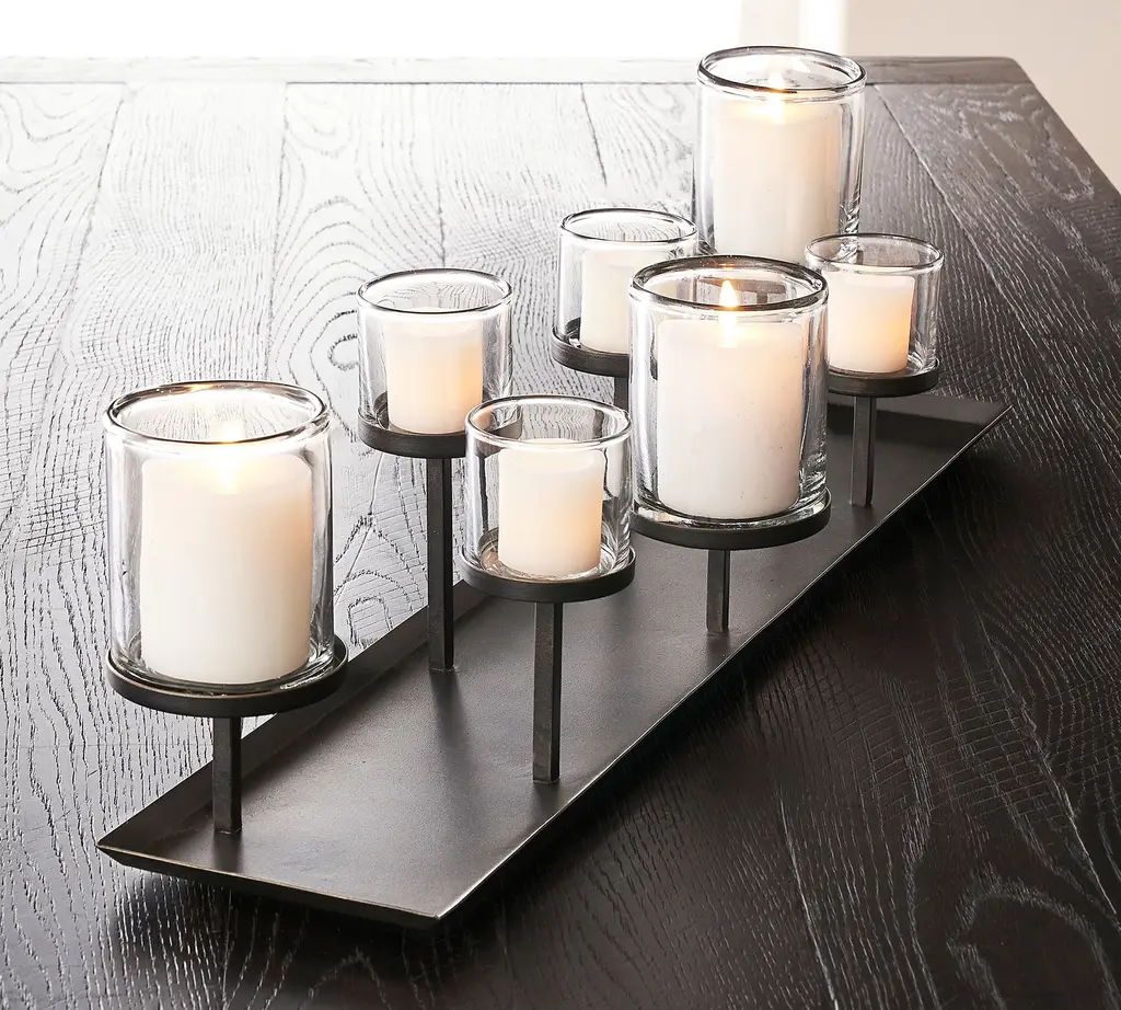 With a modern matte finish and architectural angles, our Draper Collection gets glowing reviews. Crafted of steel, this multi-armed pillar candle holder plays with height and light and is a surefire way to make a style statement. Add filler to the bottom tray, such as shells or botanical sprigs, to switch up the look with the season.