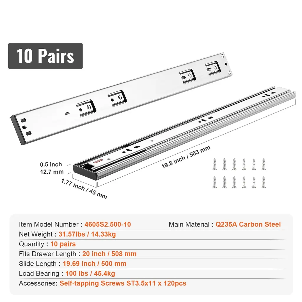 Drawer Slides Side Mount Rails Heavy Duty Full Extension Steel Track - 10 Pairs Of 20 Inch