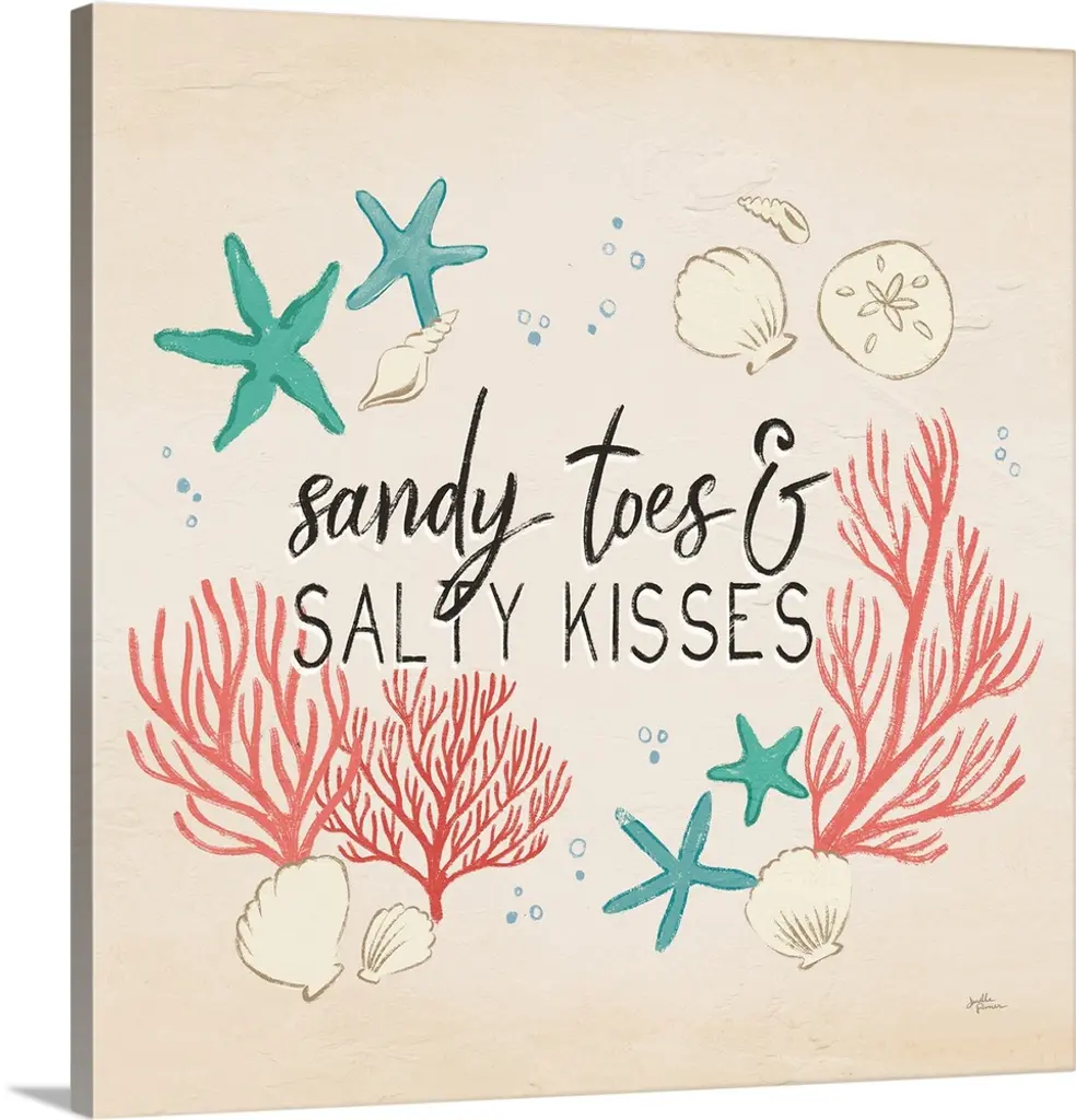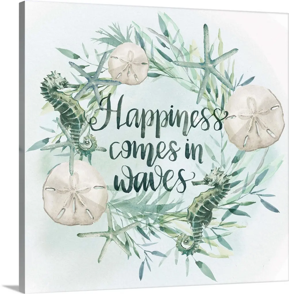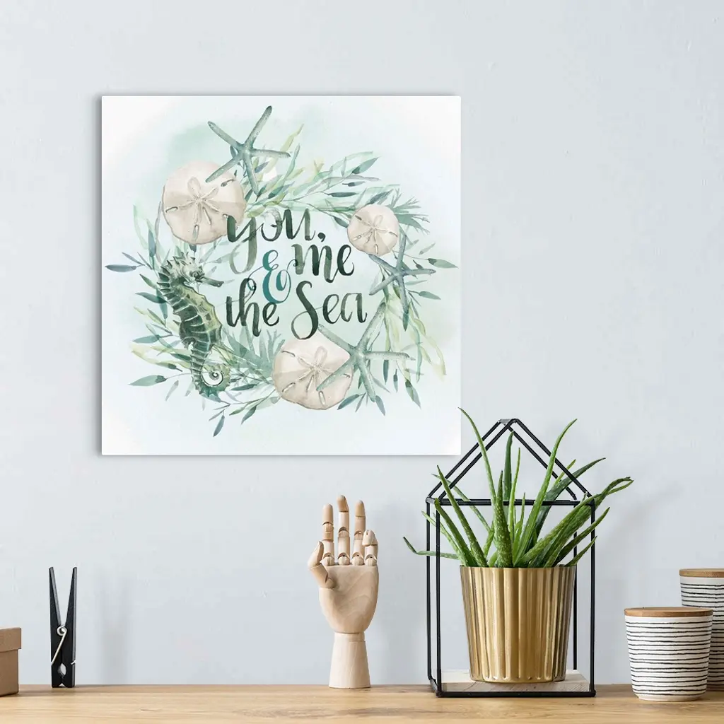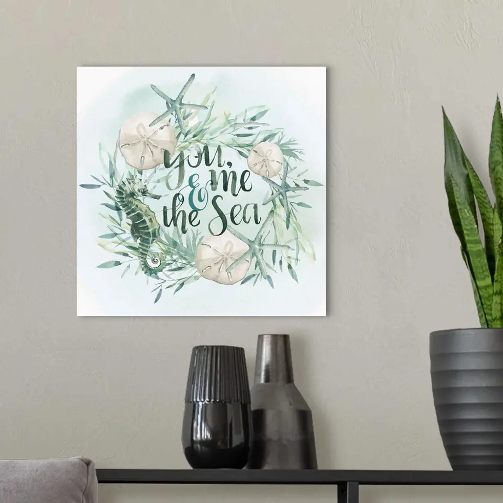 Beach-themed wreath with text "You, me, and the sea" in watercolor.