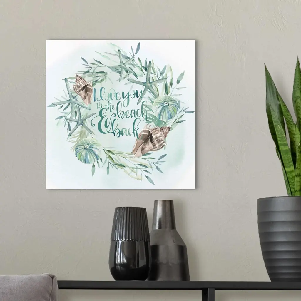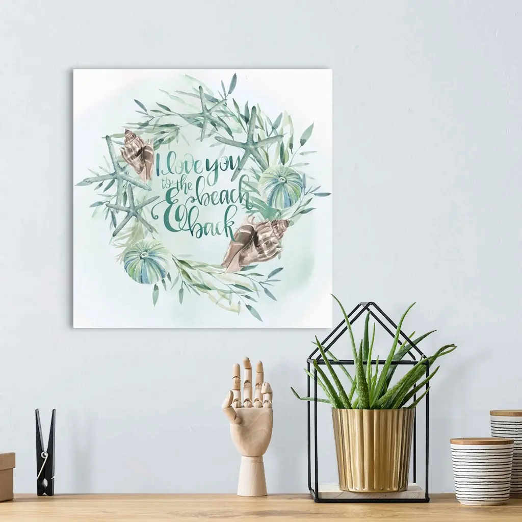 Beach-themed wreath with text "I love you to the beach and back" in watercolor.