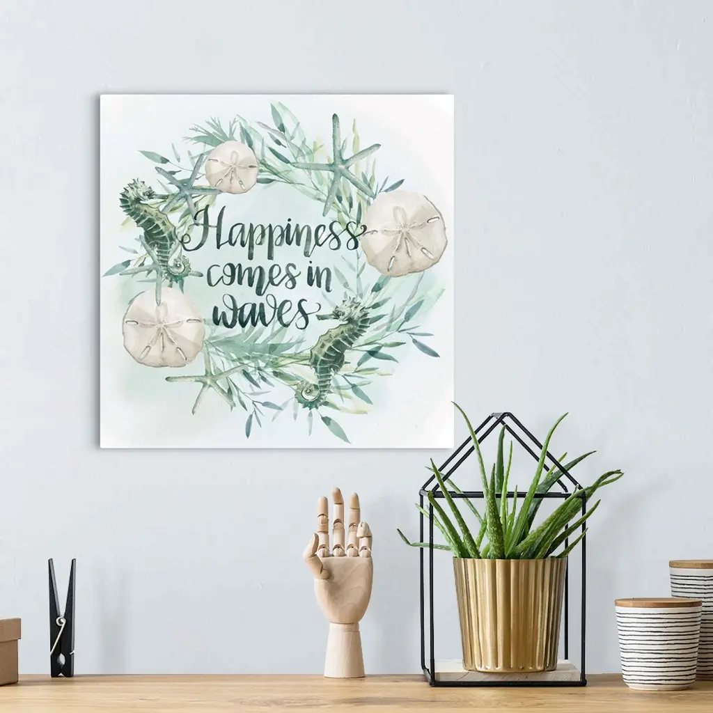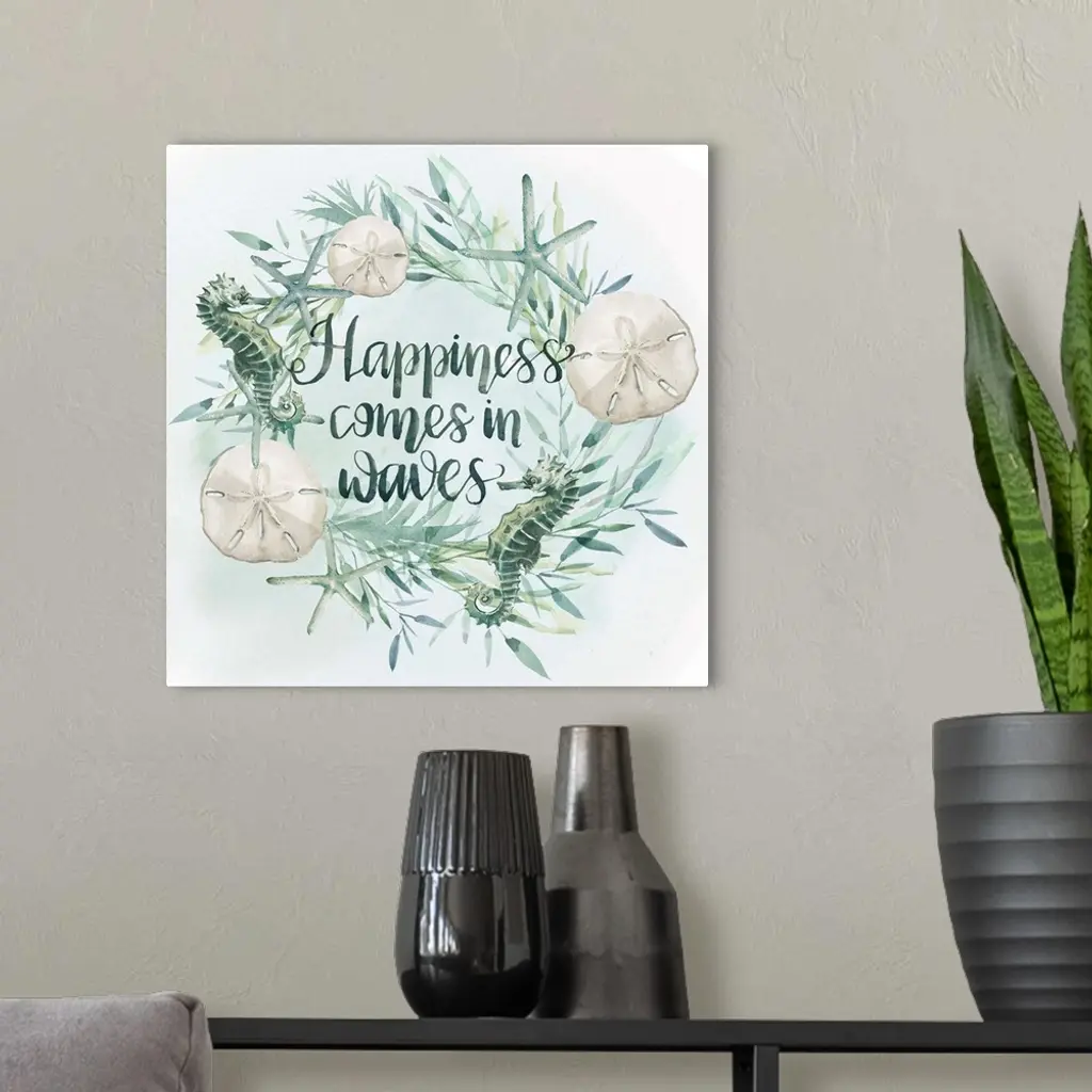 Beach-themed wreath with text "Happiness comes in waves" in watercolor.