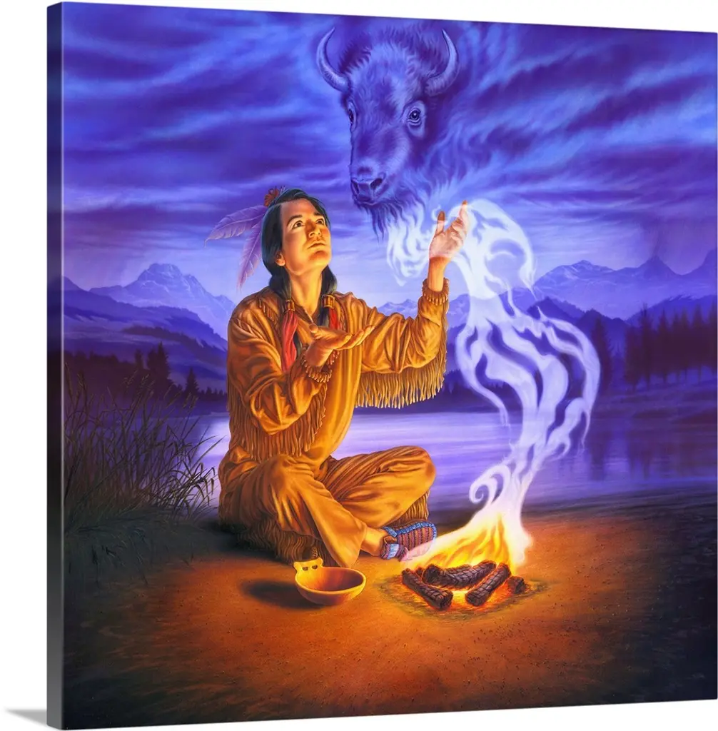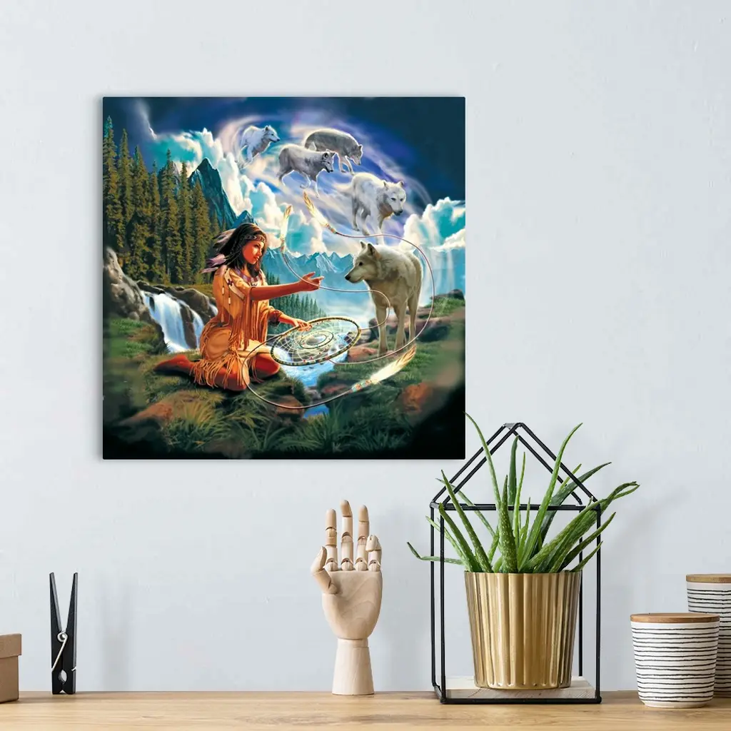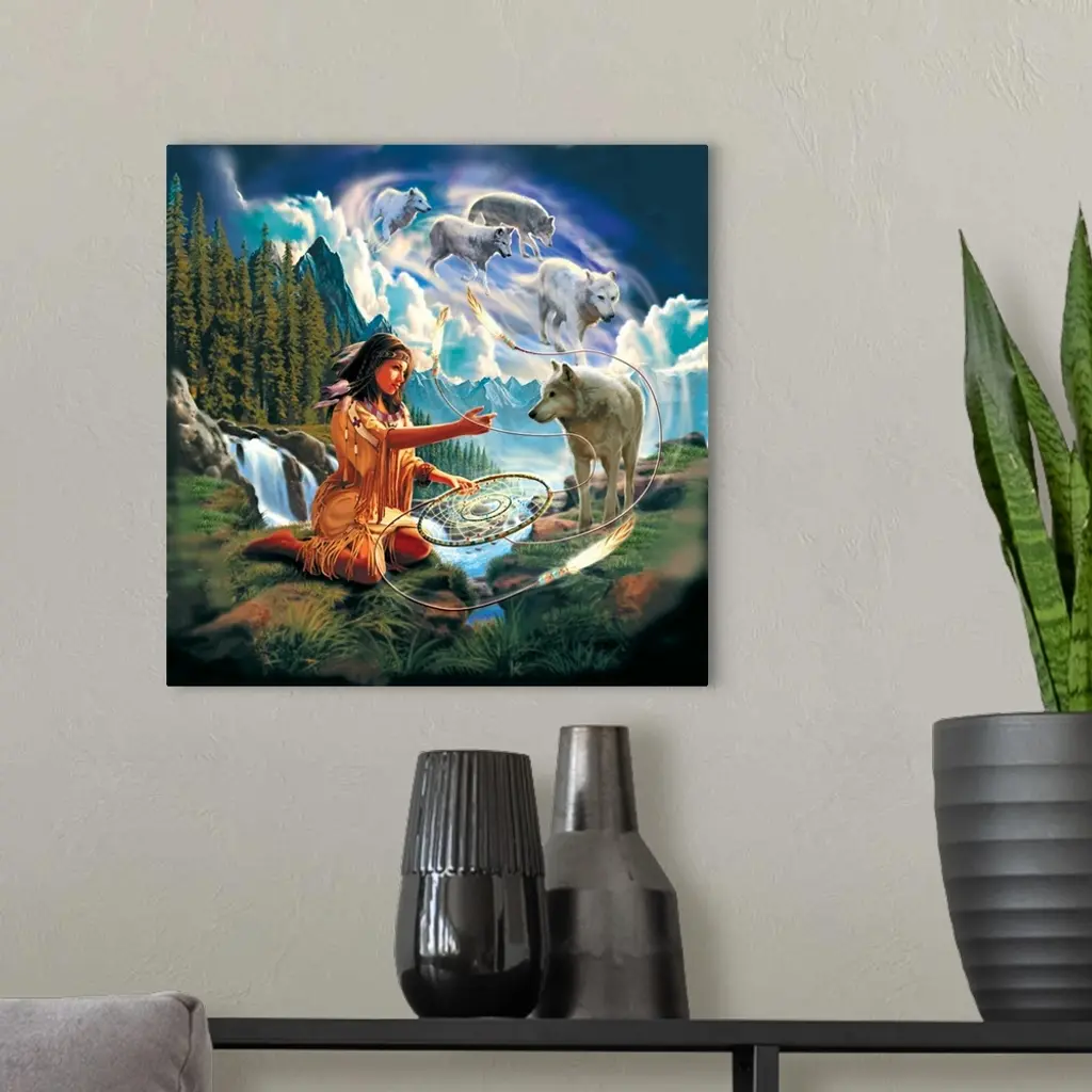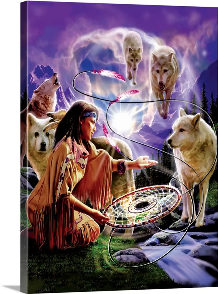 A woman dressed as a Native American sits on a cliff on the with mountains and a waterfall in the background; she is holding an enormous dream catcher in her hands and appears to be summoning grey wolves out of the clouds.