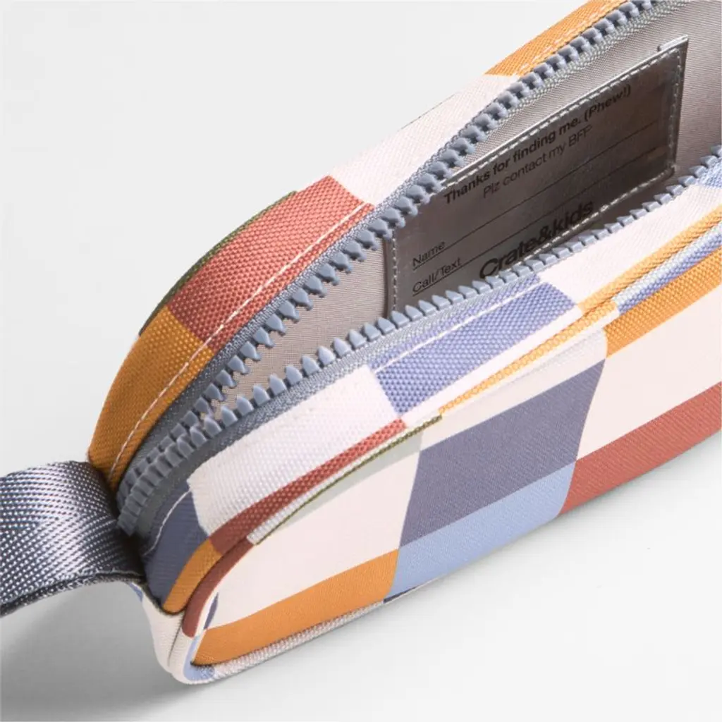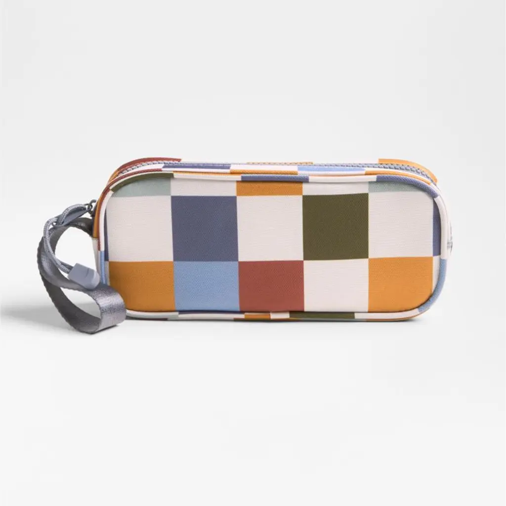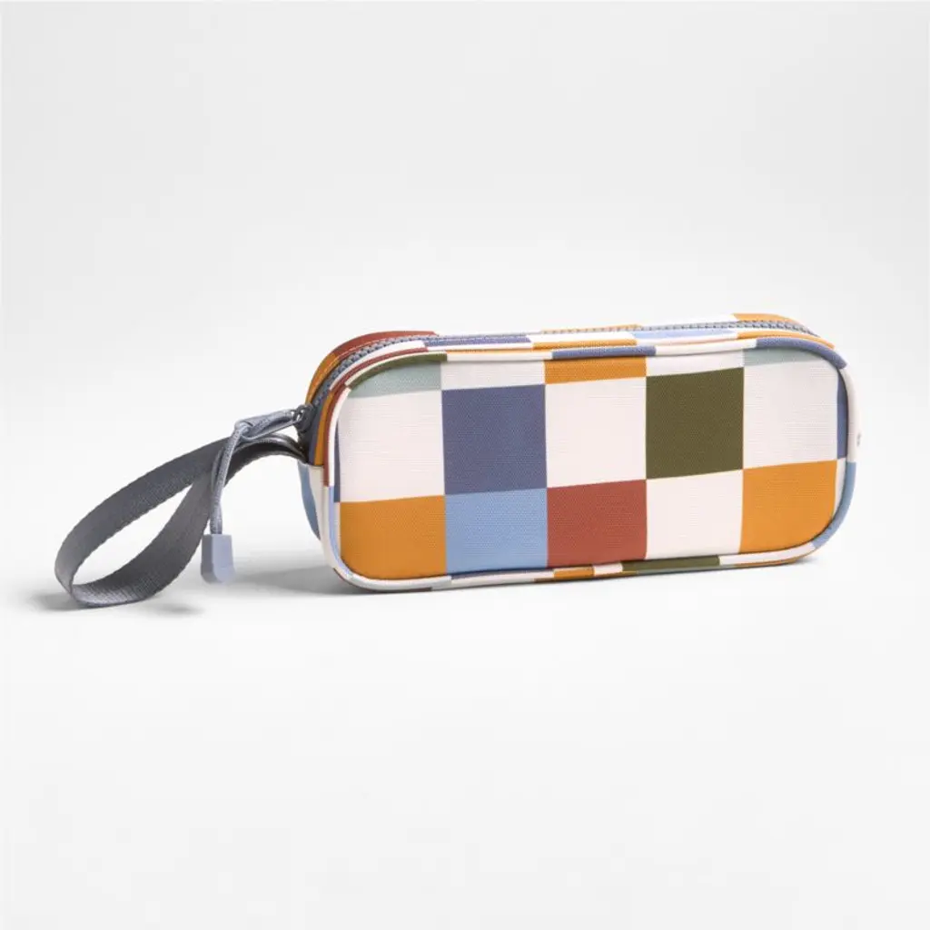 A fun pencil case that's built to handle all the thrills of the day. In a stylish checkerboard pattern, the bag has a blue-grey zipper, zipper pull and loop handle for the perfect finish. Constructed of supremely durable polyester (that includes recycled plastic bottles), the roomy, easy-clean case makes it simple to keep pens and pencils organized and accessible. Pair with the matching lunch box and backpack for a totally coordinated look.