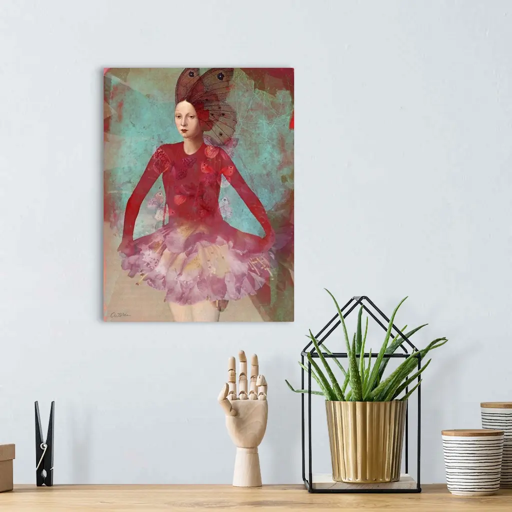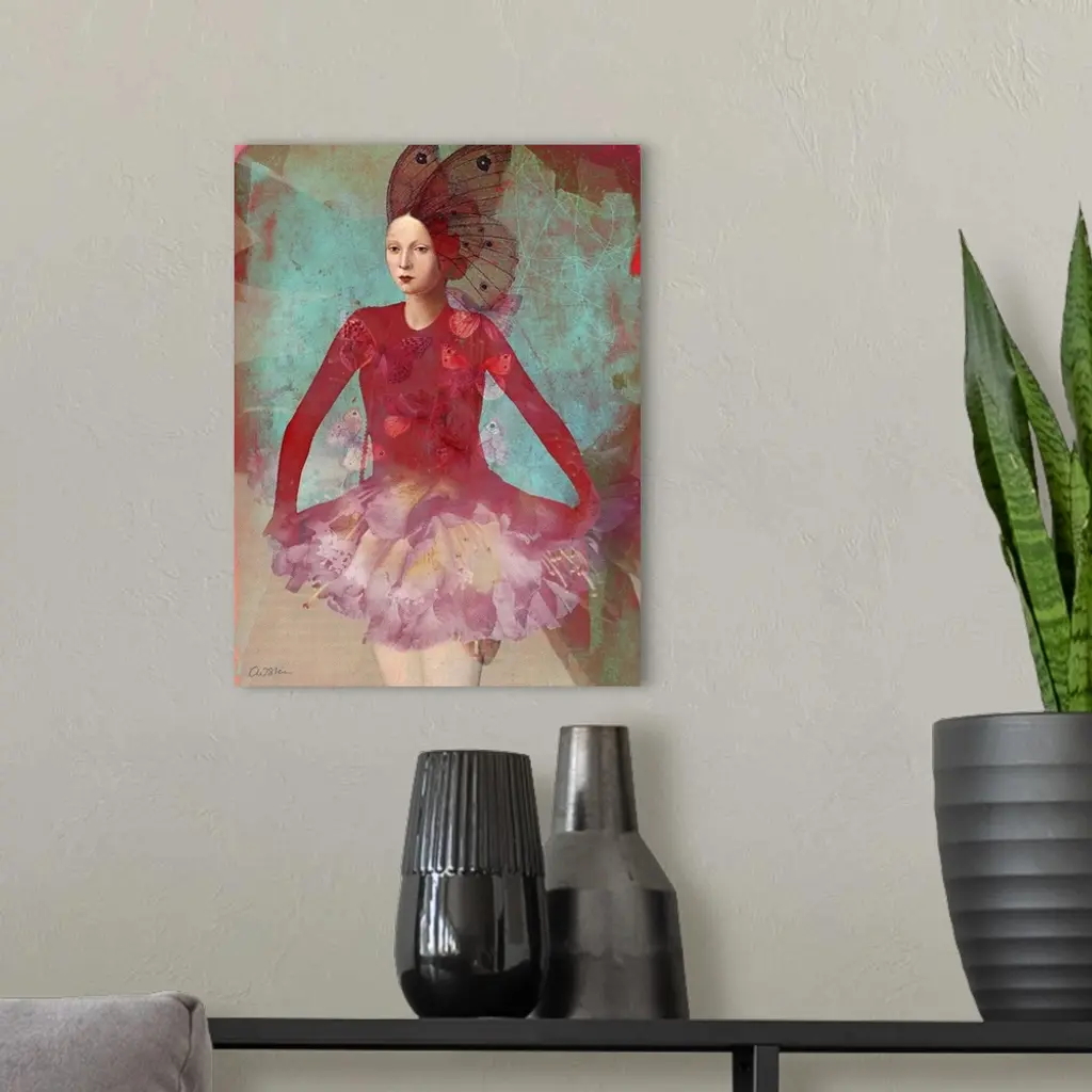 A woman in red, with a flower for a skirt, has a large butterfly on her head and others flying around her.