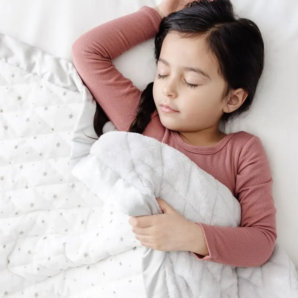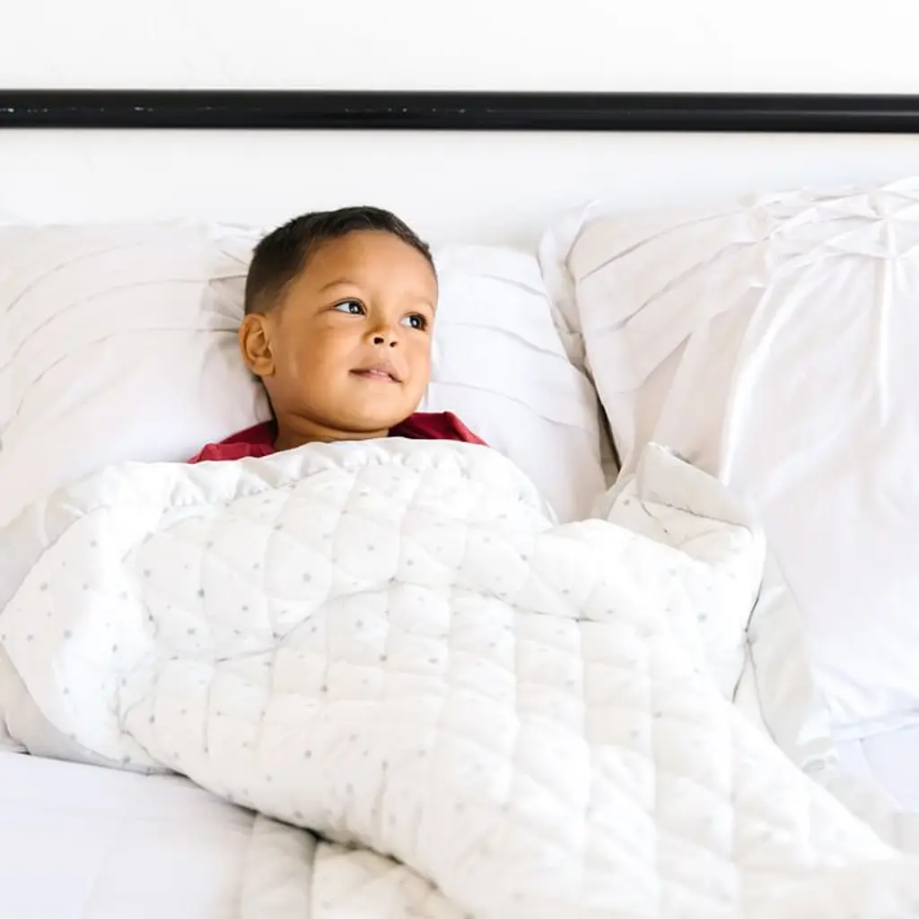 Brought you to by Dreamland Baby. 36"w x 48"l. 50% fleece, 50% minky cooling fabric shell with satin edge. Dual fabric design is lightweight and moisture-wicking for a comfortable night's sleep. Glass beaded fill is securely contained within the blanket's inner pockets. Designed to help kids fall asleep faster and stay asleep longer. Intended for children 36+ months. Each is 4 lbs. Weight is evenly distributed from shoulder to toe. Weight is 10% or less body weight. Does not restrict movement. Designed in collaboration with pediatricians, NICU nurses and Certified Sleep consultants. Approved by Pediatric Pulmonologist for breathing safety. Inner beads are BPA free. Made in China.