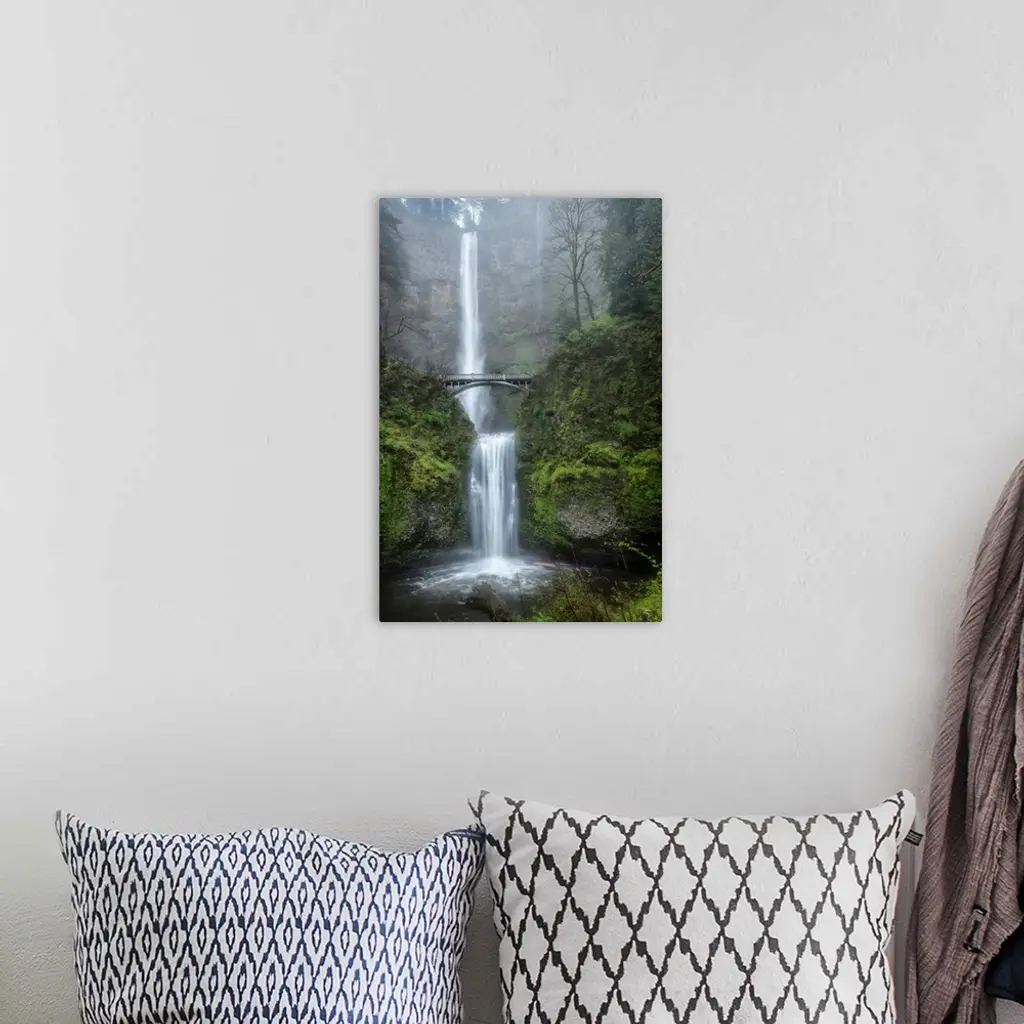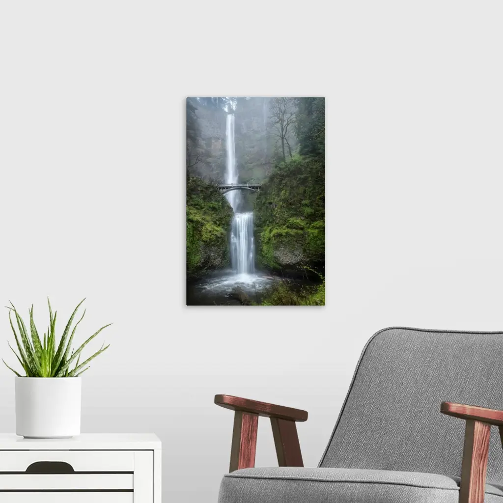 Photograph of a serene waterfall among vibrant greenery vegetation in the mist.
