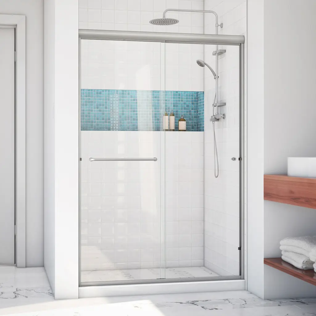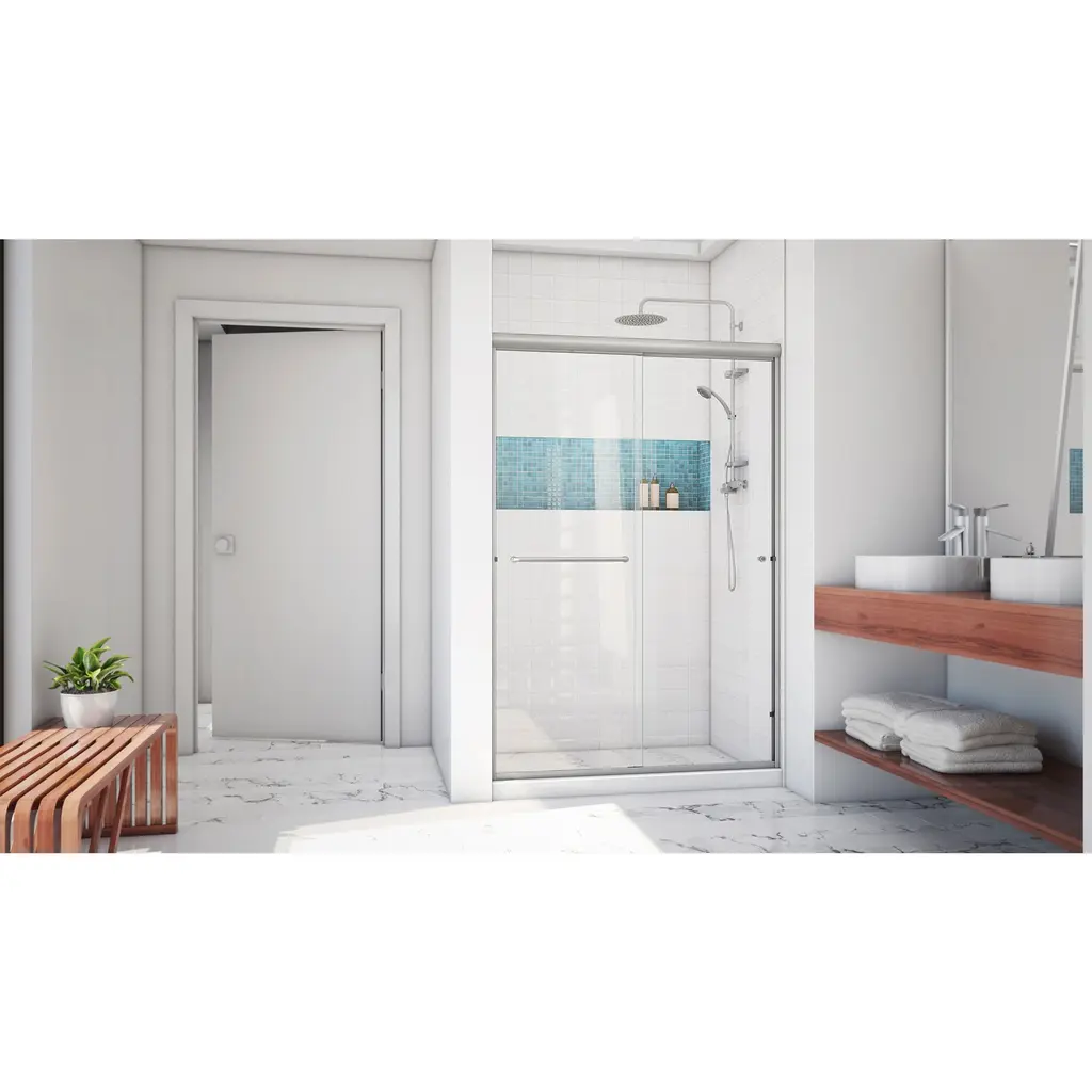 Model Size: 44 - 48 in. W x 70 3/8 in. H, Walk-in Opening: 18 - 22 in., Double sliding bypass configuration allows entry to the shower from left or right side, Reversible for a right or left installation, Integrated towel bar for convenience, .25 in. (6 mm) certified tempered glass, Aluminum water guards accommodate up to 1/4 in. for out-of-plumb (uneven) walls, Top and bottom guiderails can be trimmed up to 4 in. for width adjustment, Hardware Finish: Brushed Nickel, Glass Type: Clear, IMPORTANT! All measurements should be taken only AFTER walls are finished (tile, backwalls, etc.), Minimum threshold depth of 1 1/2 in. is required for proper installation, Drilling into the threshold is optional for installation of this product, Professional installation recommended, Lifetime Limited Manufacturer Warranty; Three (3) Year All Hardware Finishes Warranty., This product is not available with ClearMax protective glass coating, Premium Product Upgrade: DreamLine Encore Shower Door with 5/16 in. certified tempered glass, ClearMax protective glass coating, and premium rollers and hardware (SHDR-1648760-04)